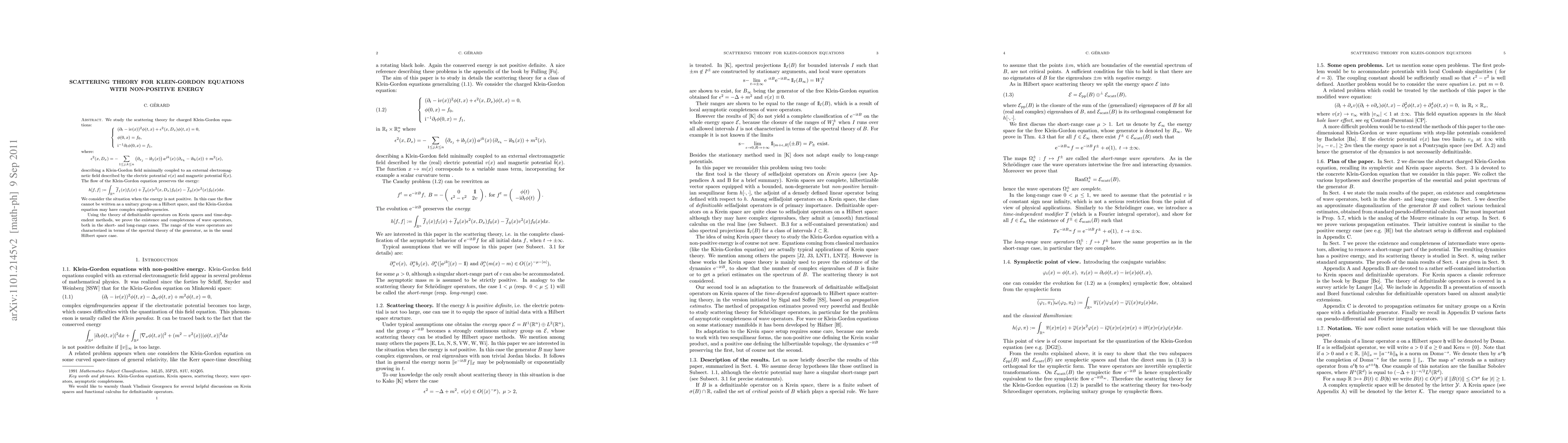 This paper investigates scattering theory for charged Klein-Gordon equations with non-positive energy, focusing on the existence and completeness of wave operators in the presence of complex eigenfrequencies. It employs definitizable operators on Krein spaces and time-dependent methods to address the non-unitary nature of the flow.