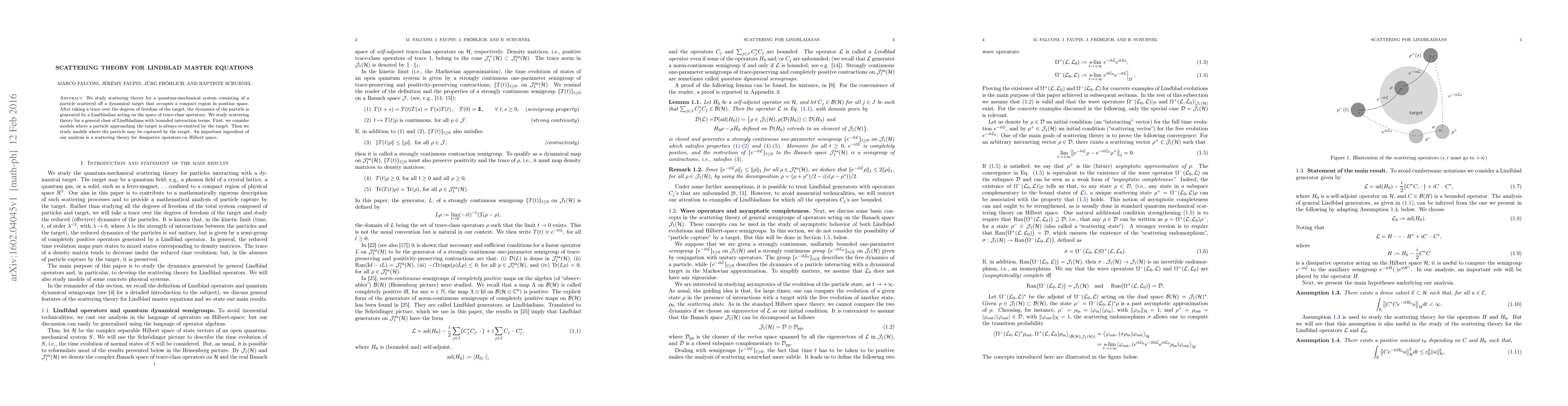 This research paper applies scattering theory to quantum systems with Lindblad master equations, studying particle-target interactions where particles may be re-emitted or captured.