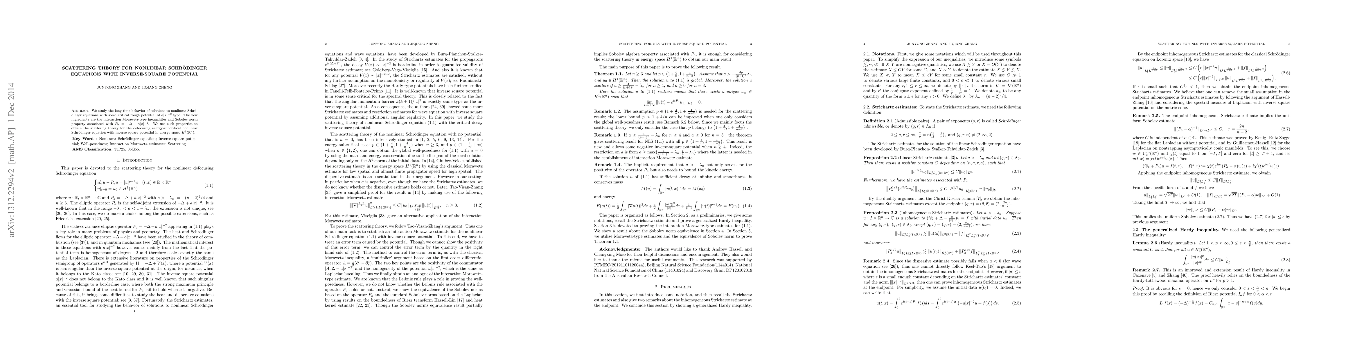 This research investigates the long-term behavior of solutions to nonlinear Schrödinger equations with inverse-square potentials, utilizing Morawetz-type inequalities and Sobolev norms to develop scattering theory for defocusing, energy-subcritical cases.
