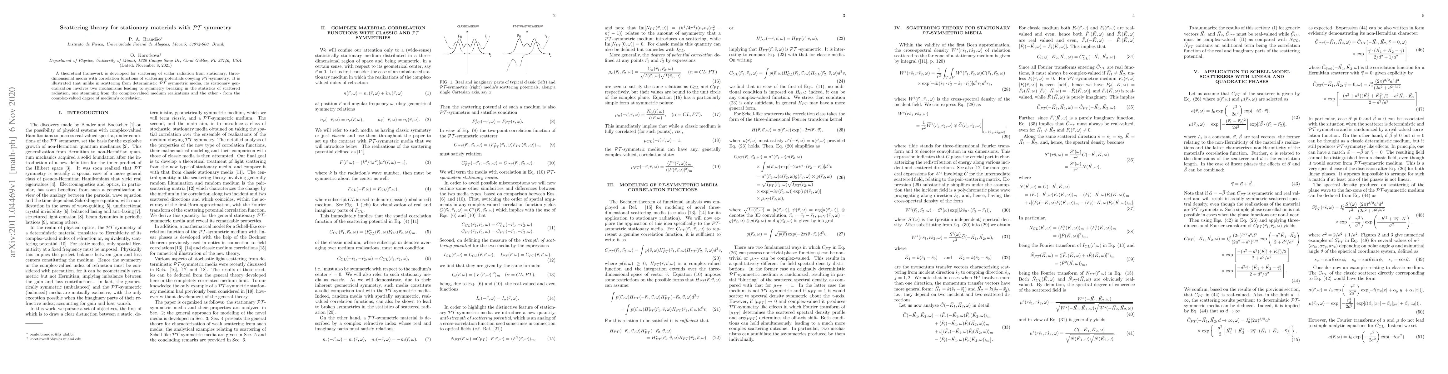 A theoretical framework is developed for scattering of scalar radiation from stationary, three-dimensional media with correlation functions of scattering potentials obeying $\mathcal{PT}$-symmetry. It is illustrated that unlike in scattering from deterministic $\mathcal{PT}$-symmetric media, its stationary generalization involves two mechanisms leading to symmetry breaking in the statistics of scattered radiation, one stemming from the complex-valued medium realizations and the other - from the complex-valued degree of medium's correlation.