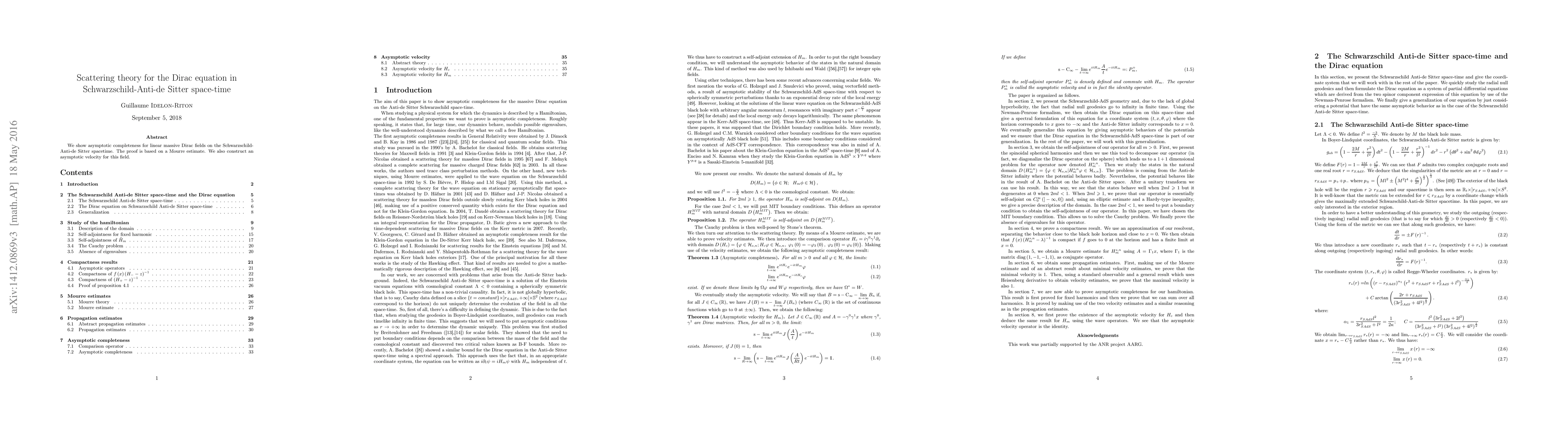 Summary: This paper proves asymptotic completeness for massive Dirac fields on Schwarzschild-Anti-de Sitter spacetime using Mourre estimates and constructs an asymptotic velocity for these fields.