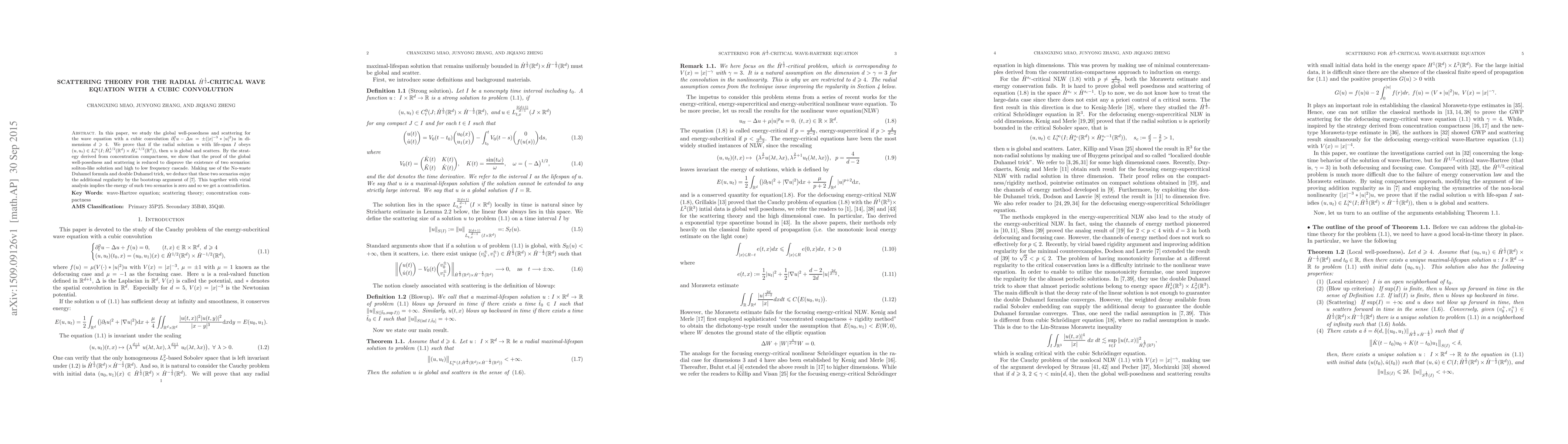 In this paper, we study the global well-posedness and scattering for the wave equation with a cubic convolution $\partial_{t}^2u-\Delta u=\pm(|x|^{-3}\ast|u|^2)u$ in dimensions $d\geq4$. We prove that if the radial solution $u$ with life-span $I$ obeys $(u,u_t)\in L_t^\infty(I;\dot H^{1/2}_x(\mathbb R^d)\times\dot H^{-1/2}_x(\mathbb R^d))$, then $u$ is global and scatters. By the strategy derived from concentration compactness, we show that the proof of the global well-posedness and scattering is reduced to disprove the existence of two scenarios: soliton-like solution and high to low frequency cascade. Making use of the No-waste Duhamel formula and double Duhamel trick, we deduce that these two scenarios enjoy the additional regularity by the bootstrap argument of [Dodson,Lawrie, Anal.PDE, 8(2015), 467-497]. This together with virial analysis implies the energy of such two scenarios is zero and so we get a contradiction.