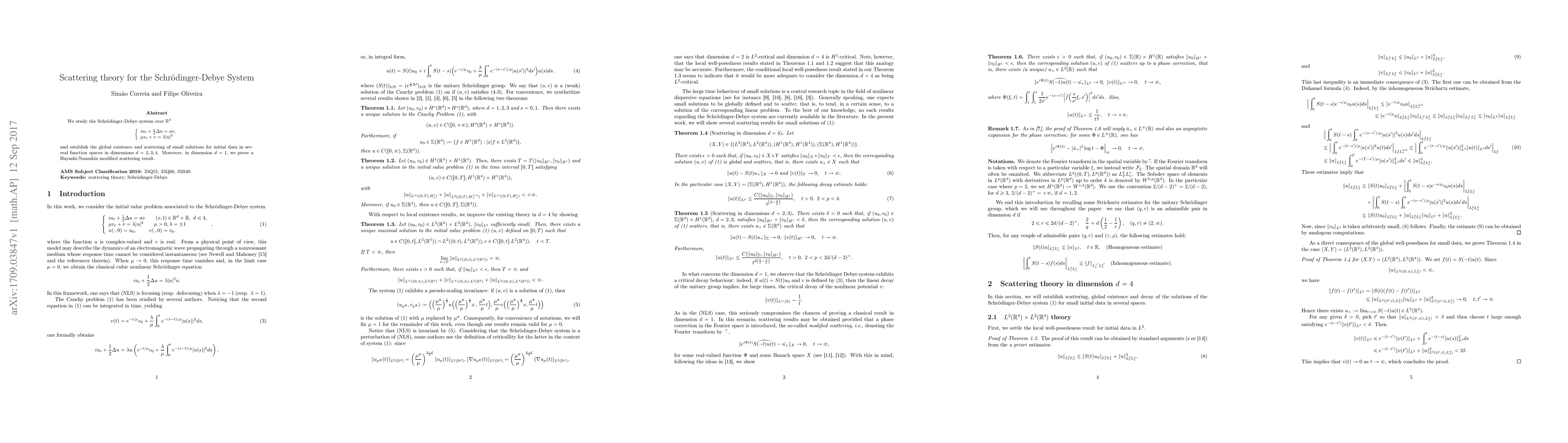 This paper investigates the global existence and scattering of small solutions for the Schrödinger-Debye system in dimensions $d=2,3,4$, and provides a modified scattering result for $d=1$. The study establishes the results for initial data in various function spaces.
