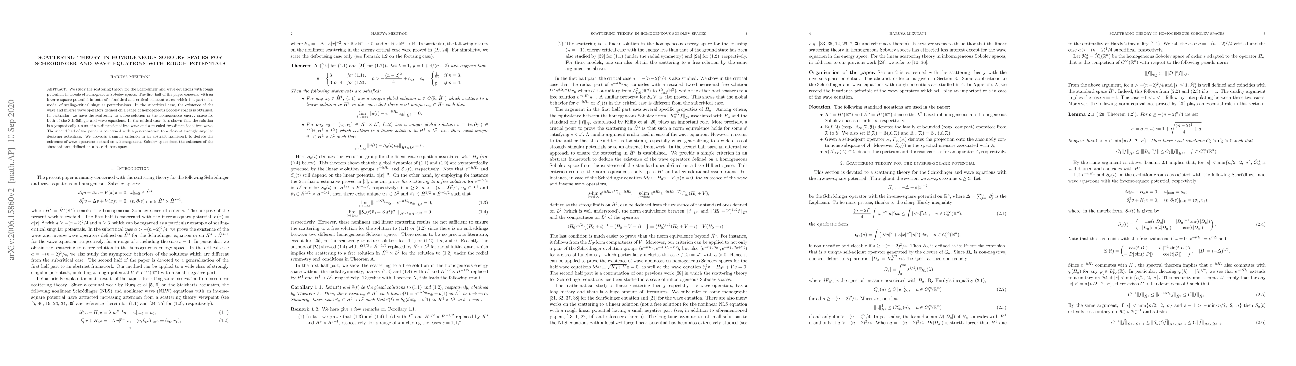 This paper investigates scattering theory for Schrödinger and wave equations with rough potentials in homogeneous Sobolev spaces, focusing on inverse-square potentials and strongly singular decaying potentials. It establishes the existence of wave operators and demonstrates scattering to free solutions in subcritical and critical cases.