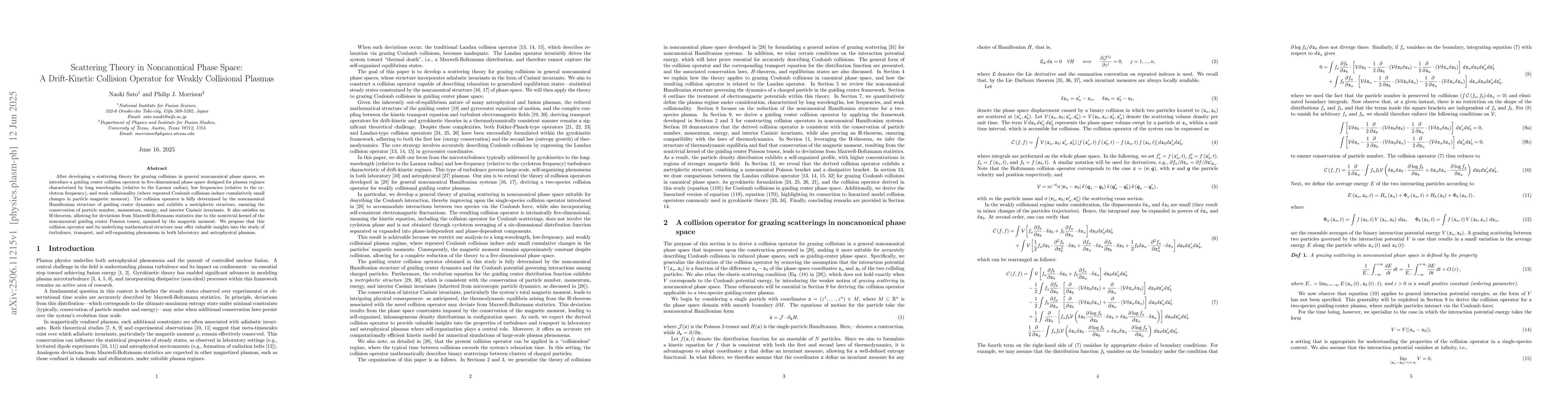 The research presents a new collision operator for weakly collisional plasmas in noncanonical phase space, conserving particle number, momentum, energy, and Casimir invariants. This operator, derived from guiding center dynamics, exhibits metriplectic structure and an H-theorem, offering insights into plasma turbulence, transport, and self-organization in laboratory and astrophysical contexts.