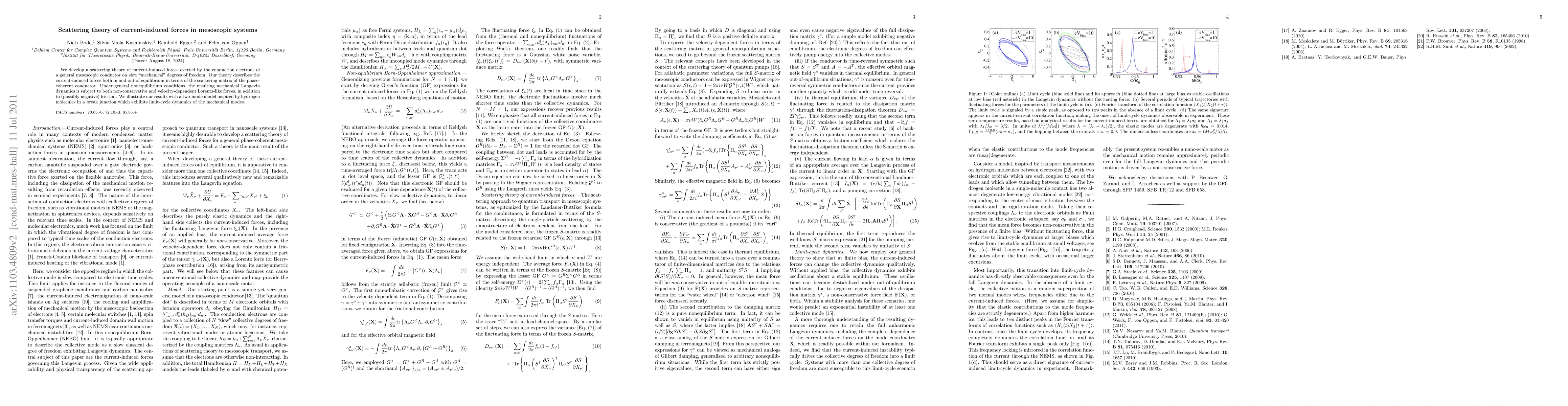 This paper develops a scattering theory to describe current-induced forces in mesoscopic conductors on mechanical degrees of freedom, revealing non-conservative and velocity-dependent forces under nonequilibrium conditions. The theory is demonstrated using a two-mode model of hydrogen molecules in a break junction.