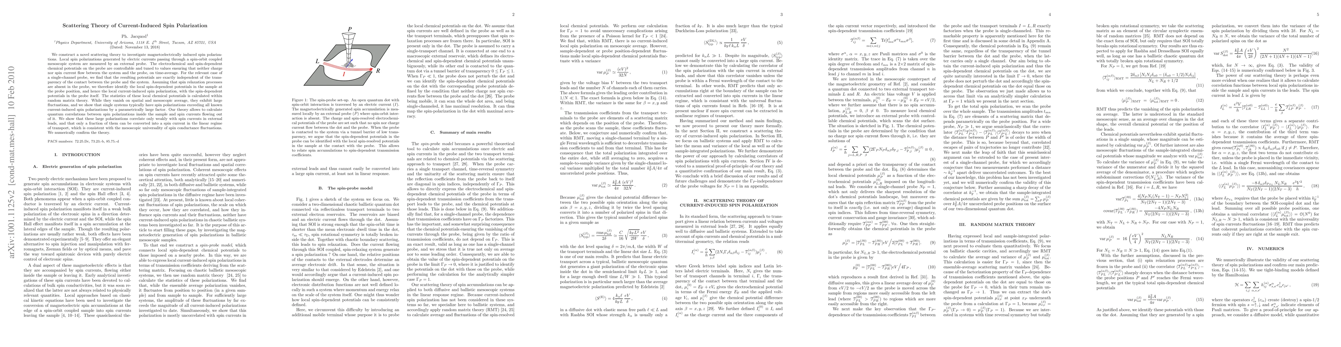 We construct a novel scattering theory to investigate magnetoelectrically induced spin polarizations. Local spin polarizations generated by electric currents passing through a spin-orbit coupled mesoscopic system are measured by an external probe. The electrochemical and spin-dependent chemical potentials on the probe are controllable and tuned to values ensuring that neither charge nor spin current flow between the system and the probe, on time-average. For the relevant case of a single-channel probe, we find that the resulting potentials are exactly independent of the transparency of the contact between the probe and the system. Assuming that spin relaxation processes are absent in the probe, we therefore identify the local spin-dependent potentials in the sample at the probe position, and hence the local current-induced spin polarization, with the spin-dependent potentials in the probe itself. The statistics of these local chemical potentials is calculated within random matrix theory. While they vanish on spatial and mesoscopic average, they exhibit large fluctuations, and we show that single systems typically have spin polarizations exceeding all known current-induced spin polarizations by a parametrically large factor. Our theory allows to calculate quantum correlations between spin polarizations inside the sample and spin currents flowing out of it. We show that these large polarizations correlate only weakly with spin currents in external leads, and that only a fraction of them can be converted into a spin current in the linear regime of transport, which is consistent with the mesoscopic universality of spin conductance fluctuations. We numerically confirm the theory.