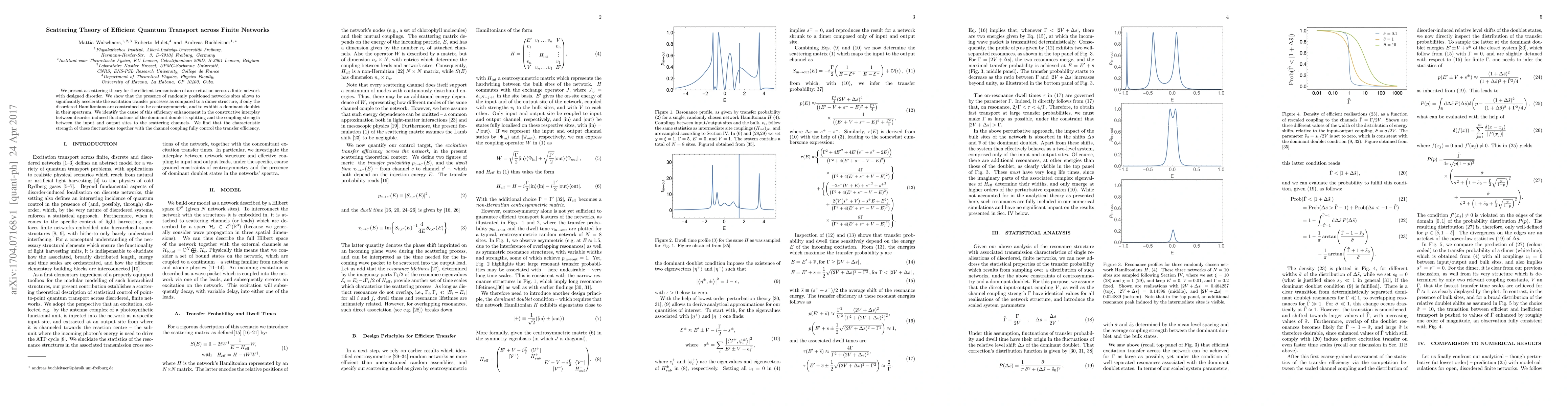 This paper develops a scattering theory for efficient quantum transport in disordered networks, demonstrating that strategically placed disorder can significantly enhance excitation transfer compared to a dimer structure, provided the Hamiltonians are centrosymmetric and have a dominant doublet. The efficiency is controlled by the interplay between disorder-induced fluctuations and the coupling strength between input and output sites.