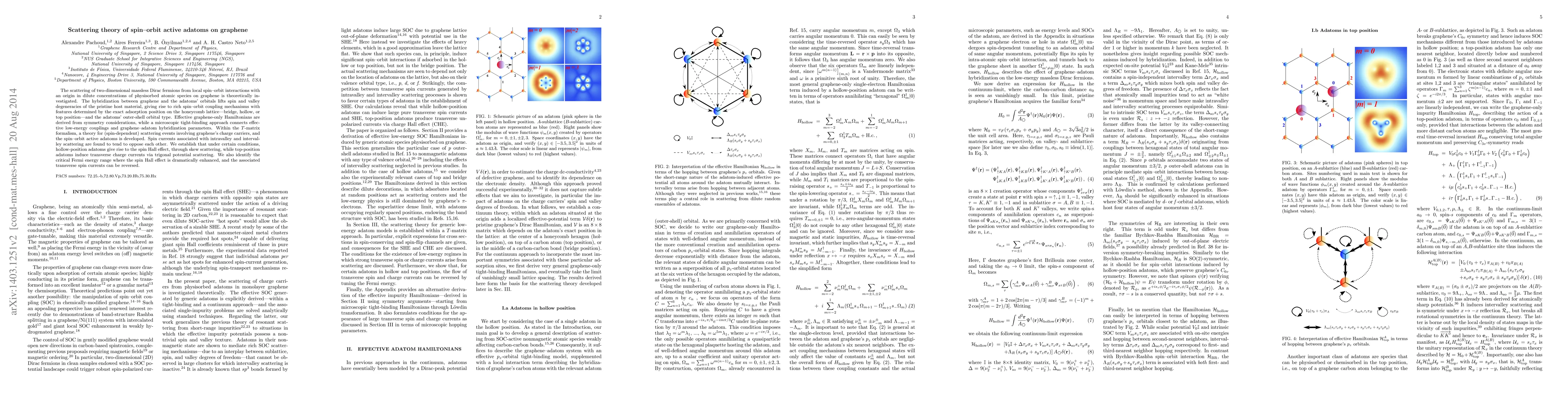 The scattering of two-dimensional massless Dirac fermions from local spin-orbit interactions with an origin in dilute concentrations of physisorbed atomic species on graphene is theoretically investigated. The hybridization between graphene and the adatoms' orbitals lifts spin and valley degeneracies of the pristine host material, giving rise to rich spin-orbit coupling mechanisms with features determined by the exact adsorption position on the honeycomb lattice - bridge, hollow or top position - and the adatoms' outer-shell orbital type. Effective graphene-only Hamiltonians are derived from symmetry considerations, while a microscopic tight-binding approach connects effective low-energy couplings and graphene-adatom hybridization parameters. Within the $T$-matrix formalism, a theory for (spin-dependent) scattering events involving graphene's charge carriers, and the spin-orbit active adatoms is developed. Spin currents associated with intravalley and intervalley scattering are found to tend to oppose each other. We establish that under certain conditions, hollow-position adatoms give rise to the spin Hall effect, through skew scattering, while top-position adatoms induce transverse charge currents via trigonal potential scattering. We also identify the critical Fermi energy range where the spin Hall effect is dramatically enhanced, and the associated transverse spin currents can be reversed.