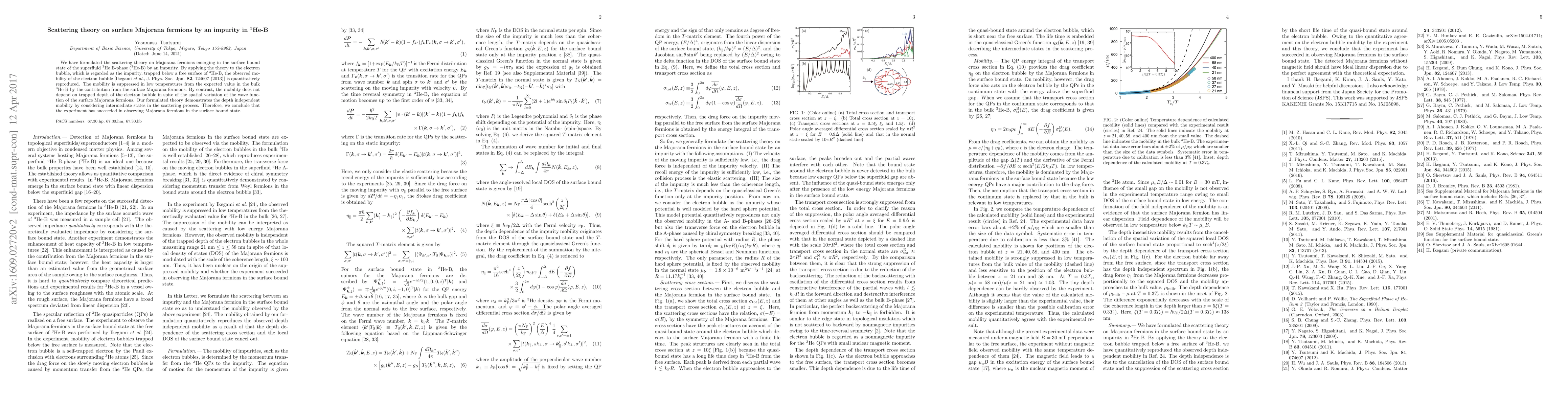 We have formulated the scattering theory on Majorana fermions emerging in the surface bound state of the superfluid $^3$He B-phase ($^3$He-B) by an impurity. By applying the theory to the electron bubble, which is regarded as the impurity, trapped below a free surface of $^3$He-B, the observed mobility of the electron bubble [Ikegami et al., J. Phys. Soc. Jpn. 82, 124607 (2013)] is quantitatively reproduced. The mobility is suppressed in low temperatures from the expected value in the bulk $^3$He-B by the contribution from the surface Majorana fermions. By contrast, the mobility does not depend on trapped depth of the electron bubble in spite of the spatial variation of the wave function of the surface Majorana fermions. Our formulated theory demonstrates the depth independent mobility by considering intermediate states in the scattering process. Therefore, we conclude that the experiment has succeeded in observing Majorana fermions in the surface bound state.