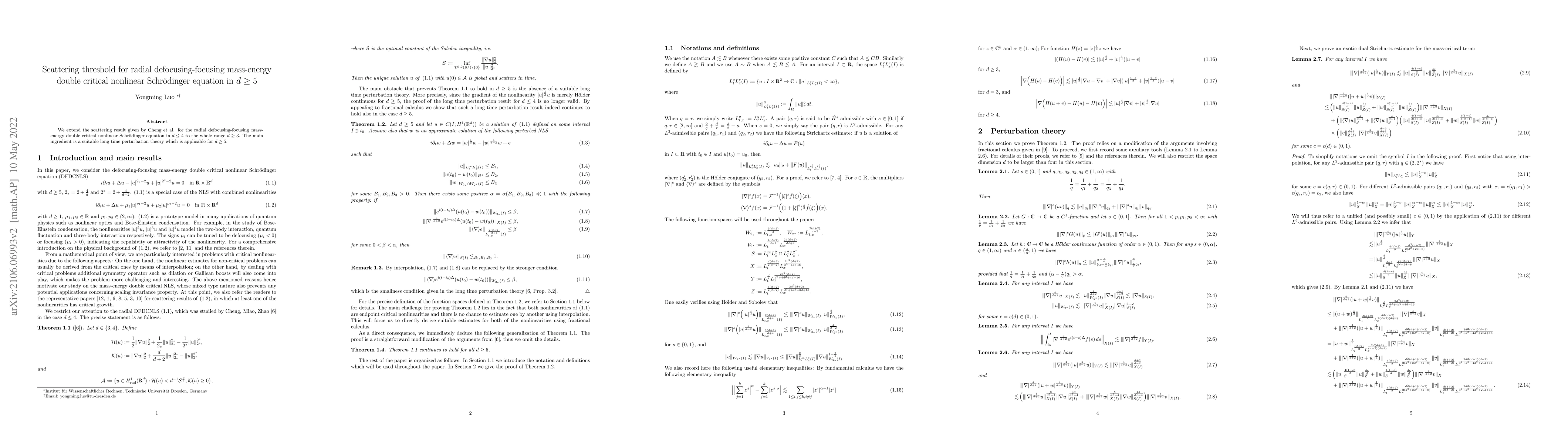 This paper extends the scattering result for the radial defocusing-focusing mass-energy double critical nonlinear Schrödinger equation to dimensions $d\geq 5$ using long time perturbation theory, completing the characterization of the scattering threshold for all dimensions $d\geq 3$.