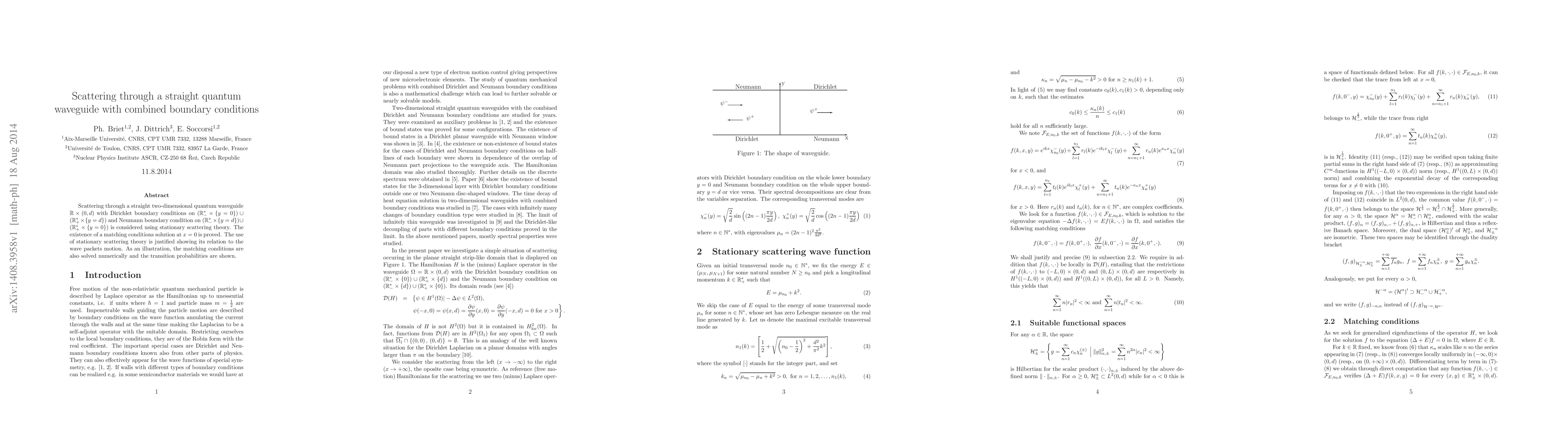Scattering through a straight two-dimensional quantum waveguide Rx(0,d) with Dirichlet boundary conditions on (-\infty,0)x{y=0} \cup (0,\infty)x{y=d} and Neumann boundary condition on (-infty,0)x{y=d} \cup (0,\infty)x{y=0} is considered using stationary scattering theory. The existence of a matching conditions solution at x=0 is proved. The use of stationary scattering theory is justified showing its relation to the wave packets motion. As an illustration, the matching conditions are also solved numerically and the transition probabilities are shown.
