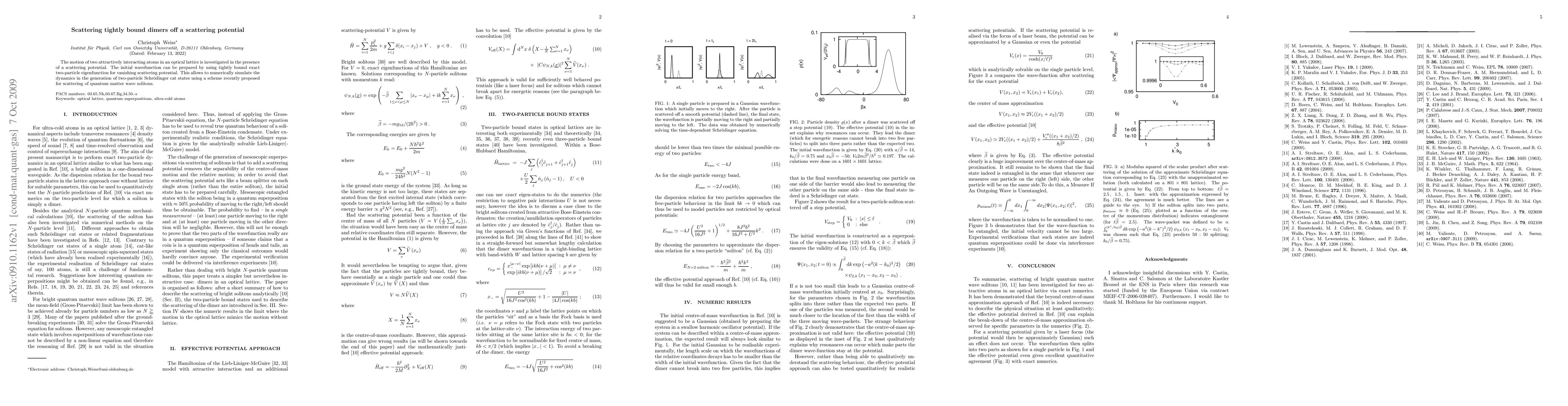 Researchers simulated the dynamics of two interacting atoms in an optical lattice with a scattering potential, generating two-particle Schrodinger cat states.