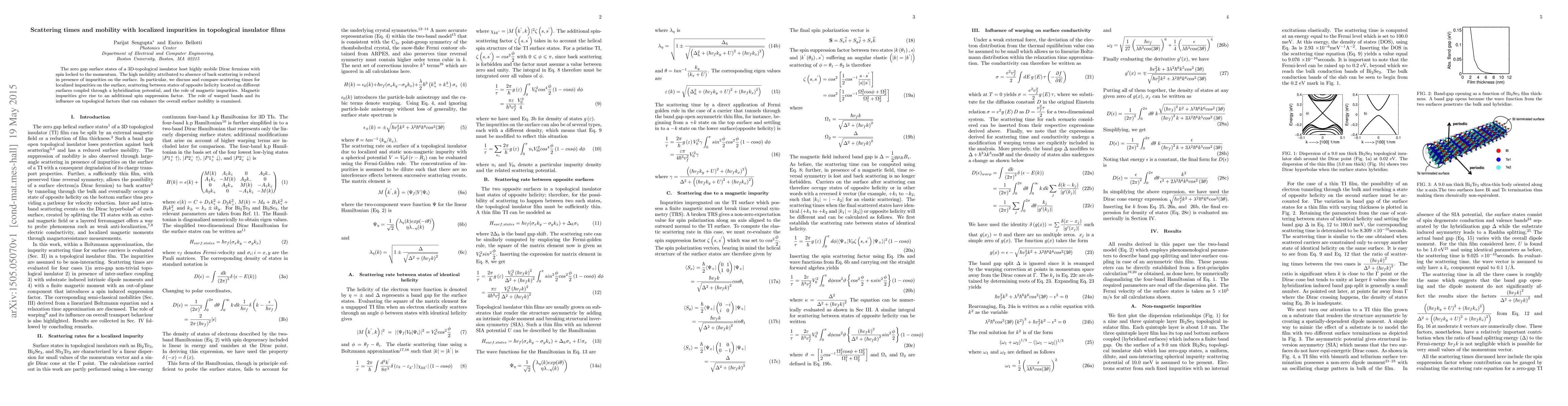 The zero gap surface states of a 3D-topological insulator host highly mobile Dirac fermions with spin locked to the momentum. The high mobility attributed to absence of back scattering is reduced in presence of impurities on the surface. In particular, we discuss and compare scattering times for localized impurities on the surface, scattering between states of opposite helicity located on different surfaces coupled through a hybridization potential, and the role of magnetic impurities. Magnetic impurities give rise to an additional spin suppression factor. The role of warped bands and its influence on topological factors that can enhance the overall surface mobility is examined.