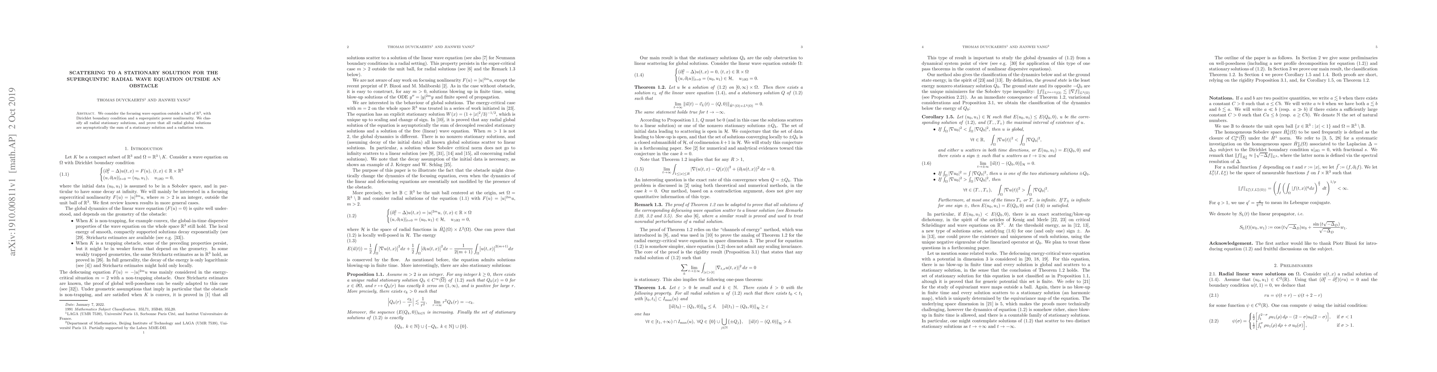 We consider the focusing wave equation outside a ball of $\R^3$, with Dirichlet boundary condition and a superquintic power nonlinearity. We classify all radial stationary solutions, and prove that all radial global solutions are asymptotically the sum of a stationary solution and a radiation term.