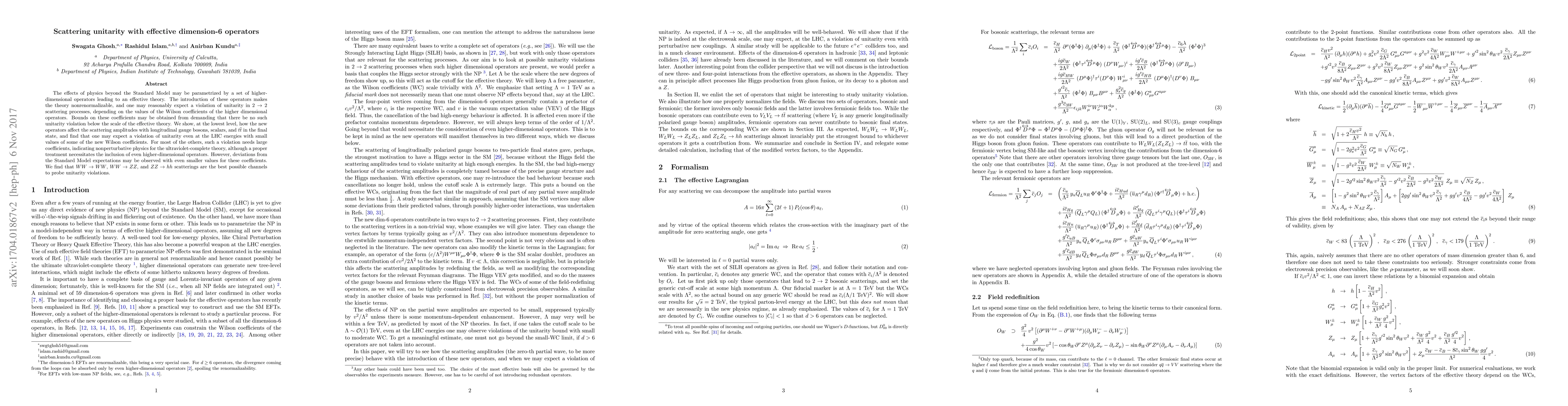 This paper investigates the impact of effective dimension-6 operators from physics beyond the Standard Model on scattering unitarity, finding that unitarity may be violated at LHC energies even with small Wilson coefficients for certain processes. Channels like $WW \to WW$, $WW\to ZZ$, and $ZZ\to hh$ are identified as optimal for probing these violations.