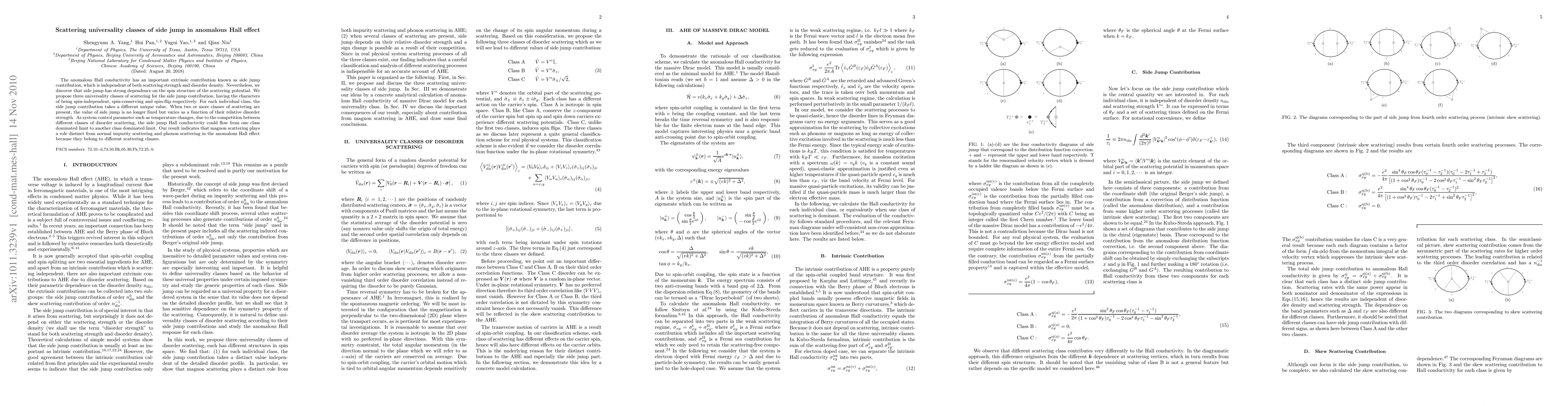 This research identifies three distinct universality classes of scattering—spin-independent, spin-conserving, and spin-flip—that govern the side jump contribution to the anomalous Hall effect. The side jump value varies with the relative strength of these classes, and temperature changes can shift the dominant scattering class, impacting the side jump Hall conductivity.
