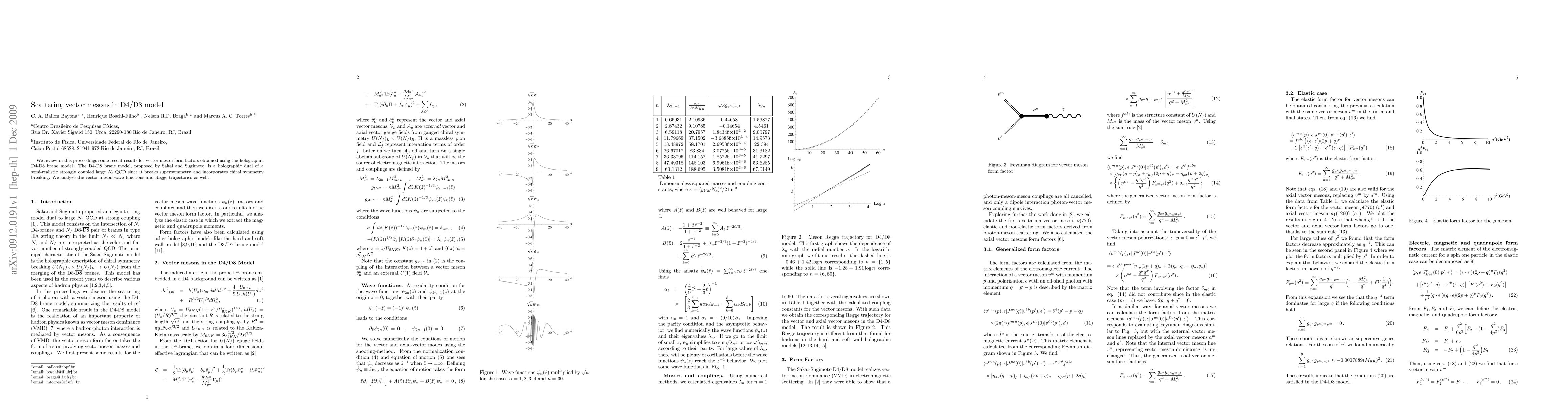 We review in this proceedings some recent results for vector meson form factors obtained using the holographic D4-D8 brane model. The D4-D8 brane model, proposed by Sakai and Sugimoto, is a holographic dual of a semi-realistic strongly coupled large N_c QCD since it breaks supersymmetry and incorporates chiral symmetry breaking. We analyze the vector meson wave functions and Regge trajectories as well.