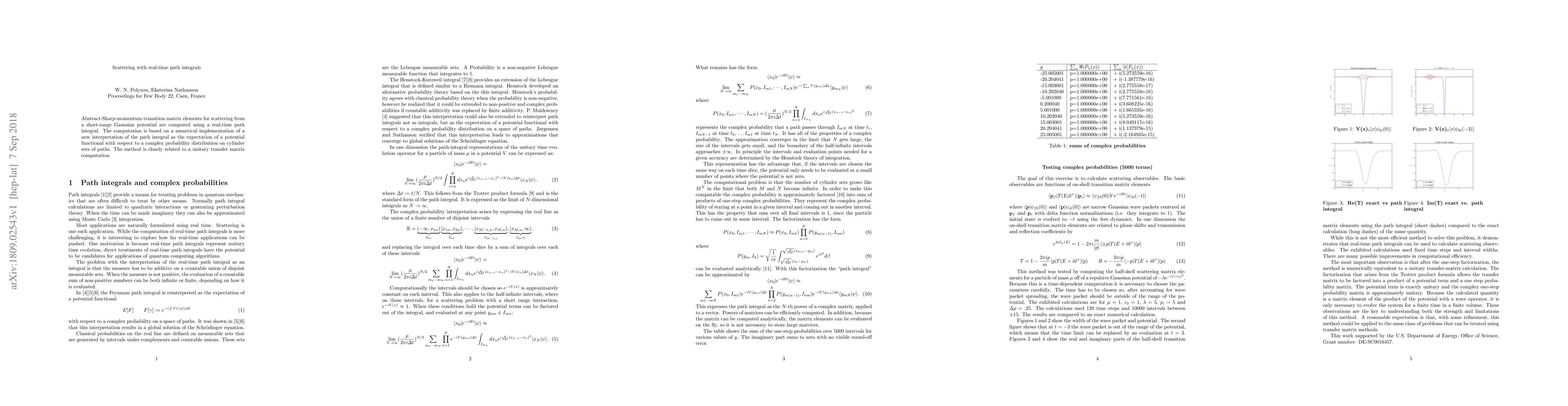 Sharp-momentum transition matrix elements for scattering from a short-range Gaussian potential are computed using a real-time path integral. The computation is based on a numerical implementation of a new interpretation of the path integral as the expectation of a potential functional with respect to a complex probability distribution on cylinder sets of paths. The method is closely related to a unitary transfer matrix computation.