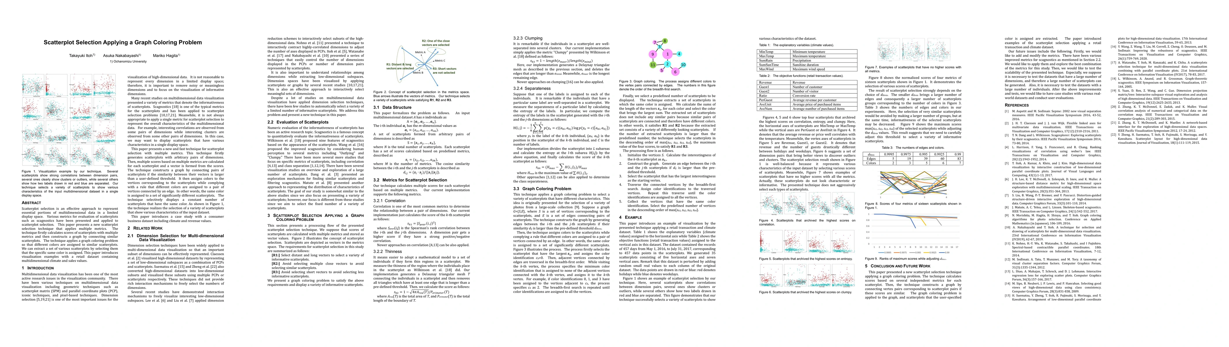 The research presents a new scatterplot selection technique that applies a graph coloring problem. It calculates scores for scatterplots using multiple metrics and constructs a graph where similar scatterplots are connected. A graph coloring problem is then applied to select a variety of informative scatterplots.