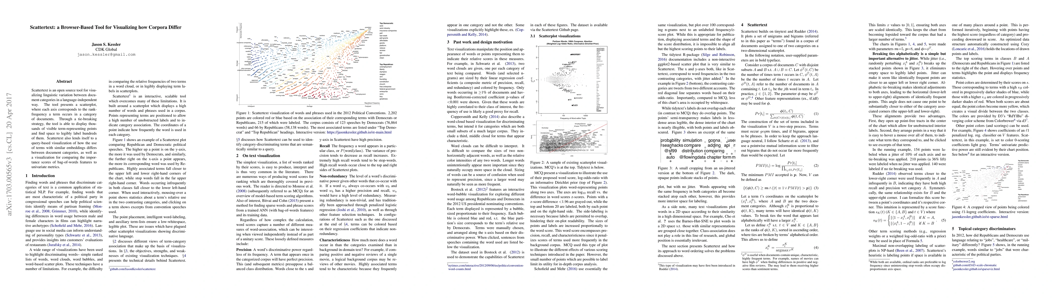 Scattertext is an open source tool for visualizing linguistic variation between document categories in a language-independent way. The tool presents a scatterplot, where each axis corresponds to the rank-frequency a term occurs in a category of documents. Through a tie-breaking strategy, the tool is able to display thousands of visible term-representing points and find space to legibly label hundreds of them. Scattertext also lends itself to a query-based visualization of how the use of terms with similar embeddings differs between document categories, as well as a visualization for comparing the importance scores of bag-of-words features to univariate metrics.