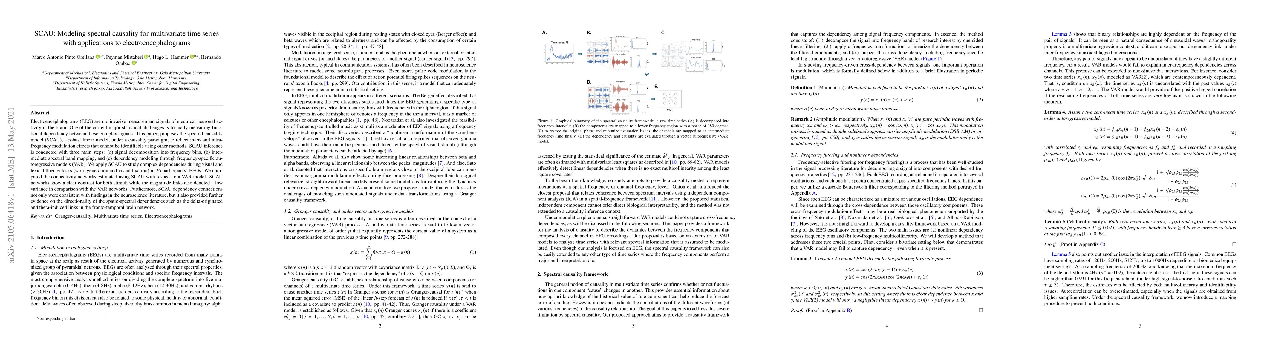 Electroencephalograms (EEG) are noninvasive measurement signals of electrical neuronal activity in the brain. One of the current major statistical challenges is formally measuring functional dependency between those complex signals. This paper, proposes the spectral causality model (SCAU), a robust linear model, under a causality paradigm, to reflect inter- and intra-frequency modulation effects that cannot be identifiable using other methods. SCAU inference is conducted with three main steps: (a) signal decomposition into frequency bins, (b) intermediate spectral band mapping, and (c) dependency modeling through frequency-specific autoregressive models (VAR). We apply SCAU to study complex dependencies during visual and lexical fluency tasks (word generation and visual fixation) in 26 participants' EEGs. We compared the connectivity networks estimated using SCAU with respect to a VAR model. SCAU networks show a clear contrast for both stimuli while the magnitude links also denoted a low variance in comparison with the VAR networks. Furthermore, SCAU dependency connections not only were consistent with findings in the neuroscience literature, but it also provided further evidence on the directionality of the spatio-spectral dependencies such as the delta-originated and theta-induced links in the fronto-temporal brain network.