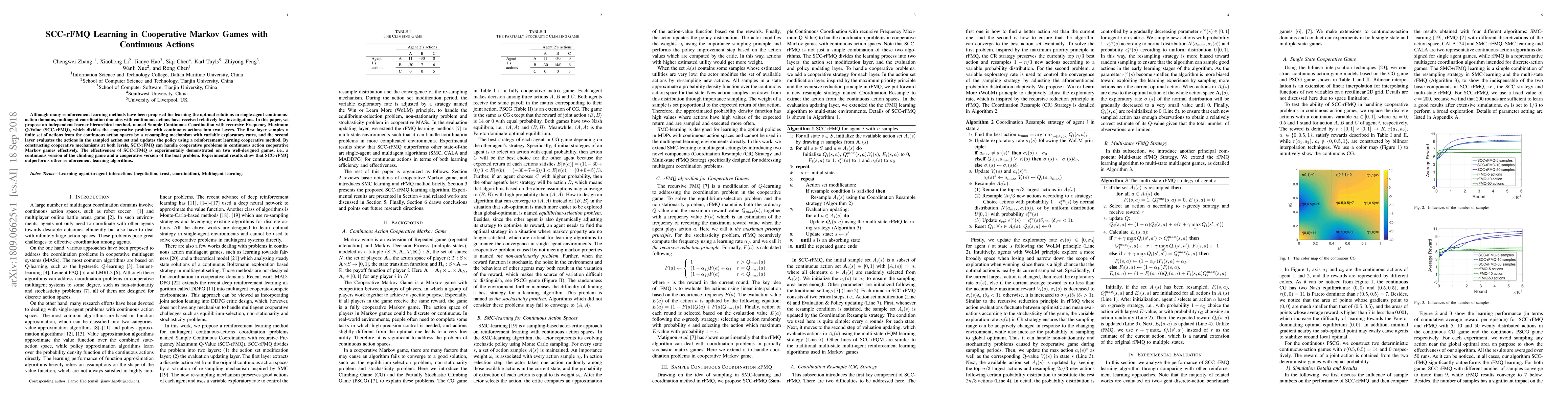 This paper proposes SCC-rFMQ, a hierarchical reinforcement learning method for multiagent coordination in continuous action cooperative Markov games. It divides the problem into two layers: one samples discrete actions from continuous spaces, and the other evaluates and updates policies cooperatively. Experimental results on climbing and boat games show SCC-rFMQ outperforms other algorithms.