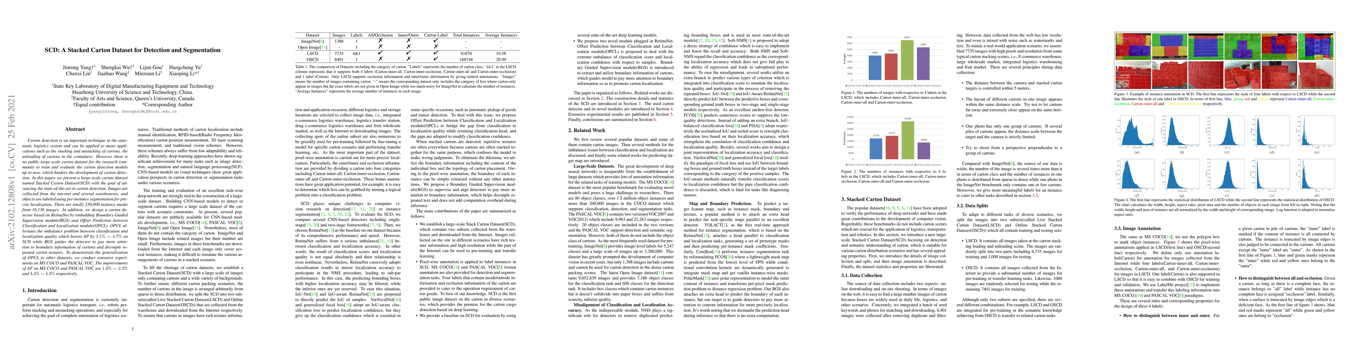 Carton detection is an important technique in the automatic logistics system and can be applied to many applications such as the stacking and unstacking of cartons, the unloading of cartons in the containers. However, there is no public large-scale carton dataset for the research community to train and evaluate the carton detection models up to now, which hinders the development of carton detection. In this paper, we present a large-scale carton dataset named Stacked Carton Dataset(SCD) with the goal of advancing the state-of-the-art in carton detection. Images are collected from the internet and several warehourses, and objects are labeled using per-instance segmentation for precise localization. There are totally 250,000 instance masks from 16,136 images. In addition, we design a carton detector based on RetinaNet by embedding Offset Prediction between Classification and Localization module(OPCL) and Boundary Guided Supervision module(BGS). OPCL alleviates the imbalance problem between classification and localization quality which boosts AP by 3.1% - 4.7% on SCD while BGS guides the detector to pay more attention to boundary information of cartons and decouple repeated carton textures. To demonstrate the generalization of OPCL to other datasets, we conduct extensive experiments on MS COCO and PASCAL VOC. The improvement of AP on MS COCO and PASCAL VOC is 1.8% - 2.2% and 3.4% - 4.3% respectively.