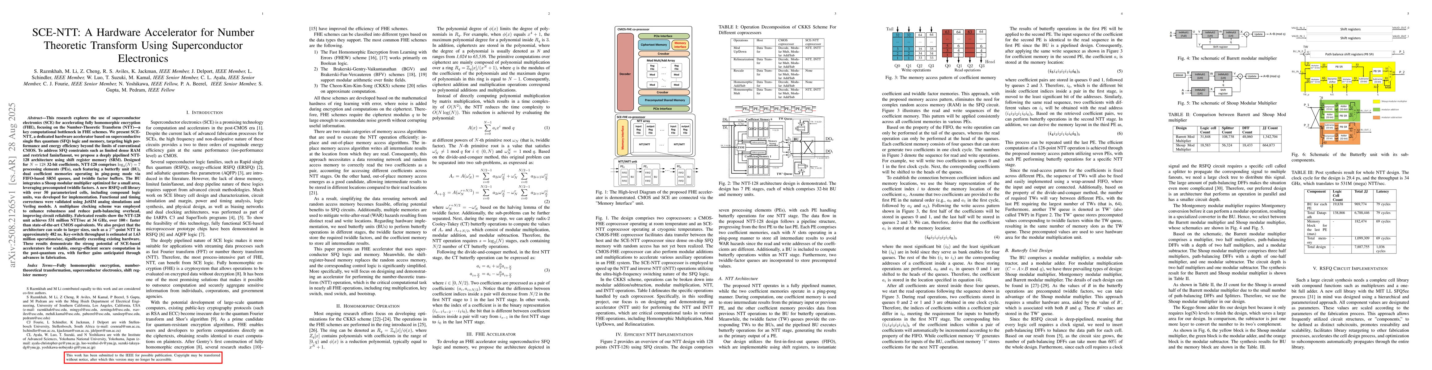 This research explores the use of superconductor electronics (SCE) for accelerating fully homomorphic encryption (FHE), focusing on the Number-Theoretic Transform (NTT), a key computational bottleneck in FHE schemes. We present SCE-NTT, a dedicated hardware accelerator based on superconductive single flux quantum (SFQ) logic and memory, targeting high performance and energy efficiency beyond the limits of conventional CMOS. To address SFQ constraints such as limited dense RAM and restricted fanin/fanout, we propose a deeply pipelined NTT-128 architecture using shift register memory (SRM). Designed for N=128 32-bit coefficients, NTT-128 comprises log2(N)=7 processing elements (PEs), each featuring a butterfly unit (BU), dual coefficient memories operating in ping-pong mode via FIFO-based SRM queues, and twiddle factor buffers. The BU integrates a Shoup modular multiplier optimized for a small area, leveraging precomputed twiddle factors. A new RSFQ cell library with over 50 parameterized cells, including compound logic units, was developed for implementation. Functional and timing correctness were validated using JoSIM analog simulations and Verilog models. A multiphase clocking scheme was employed to enhance robustness and reduce path-balancing overhead, improving circuit reliability. Fabricated results show the NTT-128 unit achieves 531 million NTT/sec at 34 GHz, over 100x faster than state-of-the-art CMOS equivalents. We also project that the architecture can scale to larger sizes, such as a 2^14-point NTT in approximately 482 ns. Key-switch throughput is estimated at 1.63 million operations/sec, significantly exceeding existing hardware. These results demonstrate the strong potential of SCE-based accelerators for scalable, energy-efficient secure computation in the post-quantum era, with further gains anticipated through advances in fabrication.