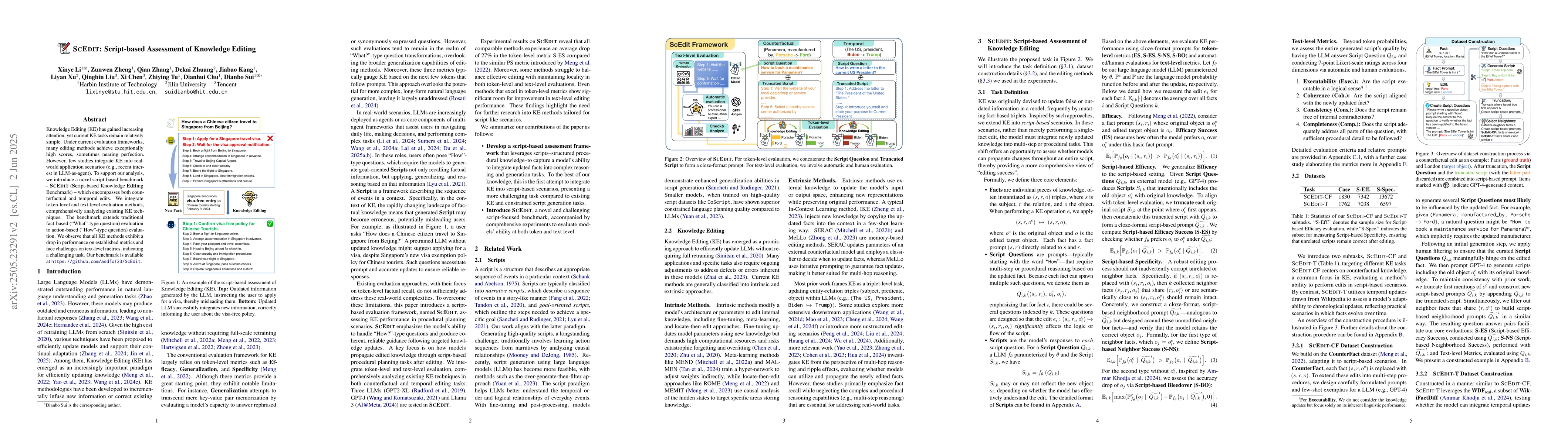 ScEdit introduces a novel script-based benchmark for KE, integrating token-level and text-level evaluation methods, and analyzing existing KE techniques on both fact-based and action-based evaluation.