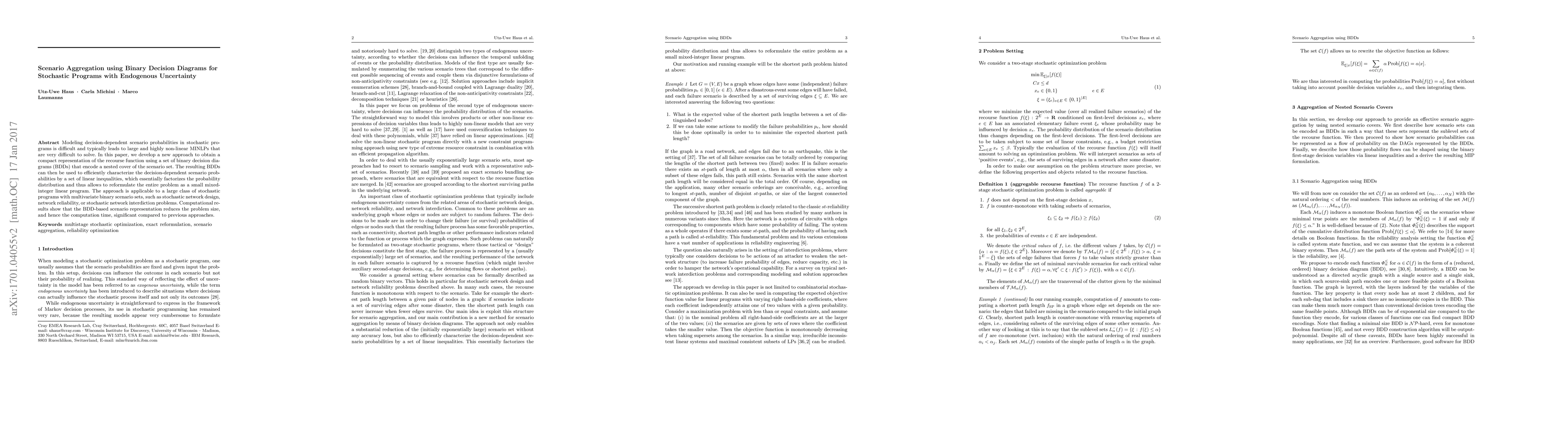 This paper proposes a method using binary decision diagrams (BDDs) to compactly represent decision-dependent scenario probabilities in stochastic programs, transforming the problem into a manageable mixed-integer linear program. The BDD-based approach significantly reduces problem size and computation time compared to traditional methods.