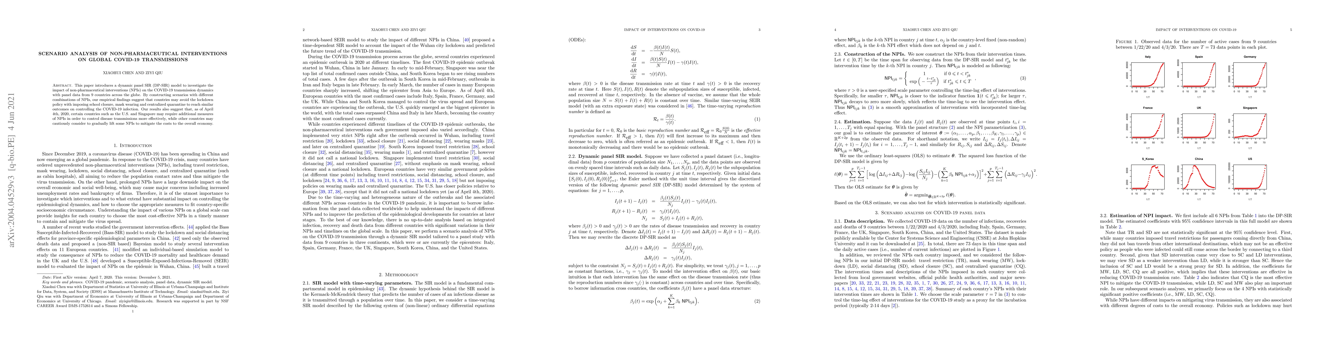 This paper introduces a dynamic panel SIR (DP-SIR) model to investigate the impact of non-pharmaceutical interventions (NPIs) on the COVID-19 transmission dynamics with panel data from 9 countries across the globe. By constructing scenarios with different combinations of NPIs, our empirical findings suggest that countries may avoid the lockdown policy with imposing school closure, mask wearing and centralized quarantine to reach similar outcomes on controlling the COVID-19 infection. Our results also suggest that, as of April 4th, 2020, certain countries such as the U.S. and Singapore may require additional measures of NPIs in order to control disease transmissions more effectively, while other countries may cautiously consider to gradually lift some NPIs to mitigate the costs to the overall economy.
