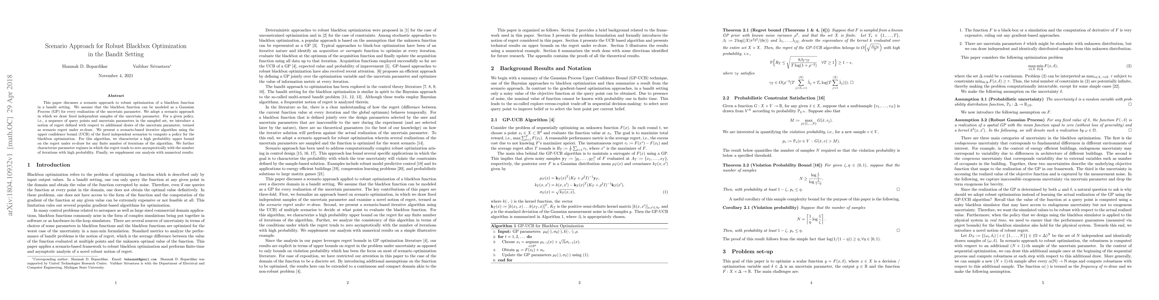 This paper proposes a scenario approach for robust blackbox optimization in a bandit setting using Gaussian Processes, introducing a scenario regret under re-draw and presenting an iterative UCB-based algorithm with regret bounds and asymptotic convergence analysis, supported by numerical results.