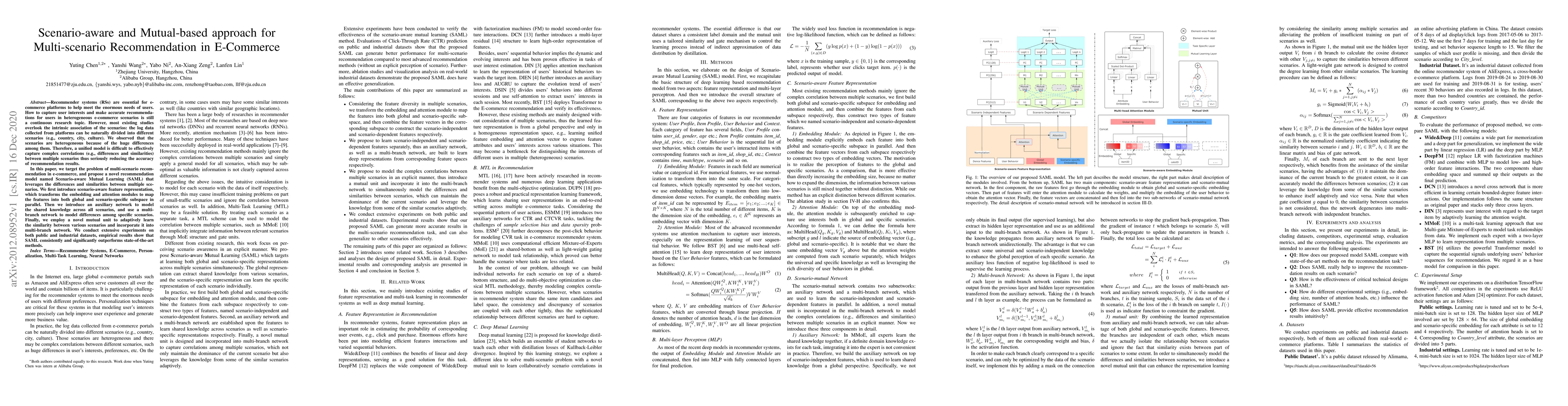 This paper proposes a novel Scenario-aware Mutual Learning (SAML) model for multi-scenario recommendation in e-commerce, addressing the challenge of capturing complex correlations between different scenarios. SAML employs scenario-aware feature representation, an auxiliary network for shared knowledge, and a multi-branch network to model differences, ultimately achieving superior performance over existing methods.