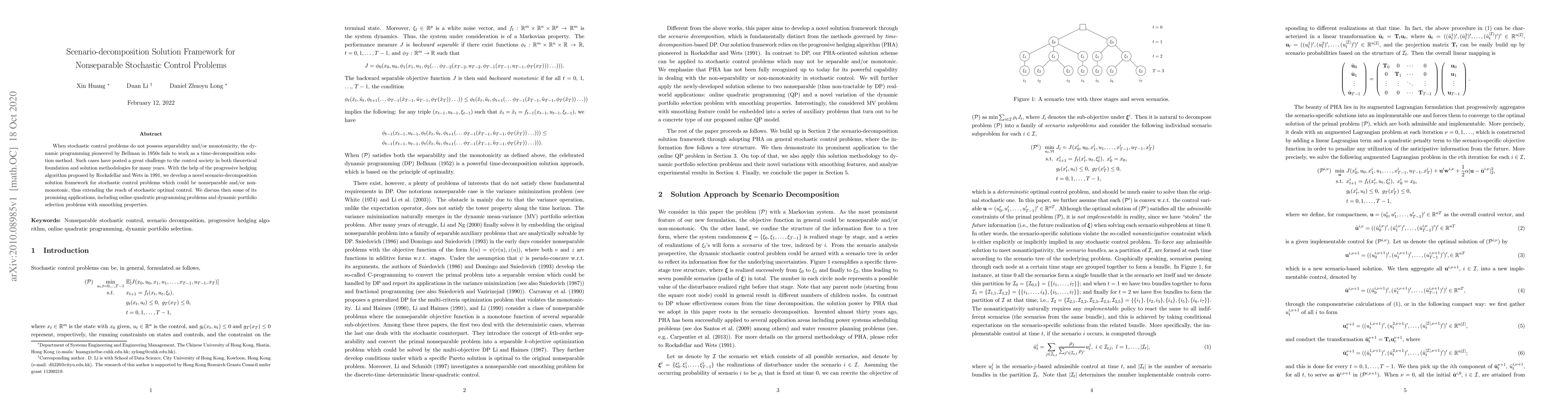 This paper introduces a scenario-decomposition solution framework for nonseparable stochastic control problems, extending the applicability of optimal control methods beyond traditional dynamic programming. The proposed framework leverages the progressive hedging algorithm to tackle non-monotonic and nonseparable scenarios, with potential applications in online quadratic programming and dynamic portfolio selection.