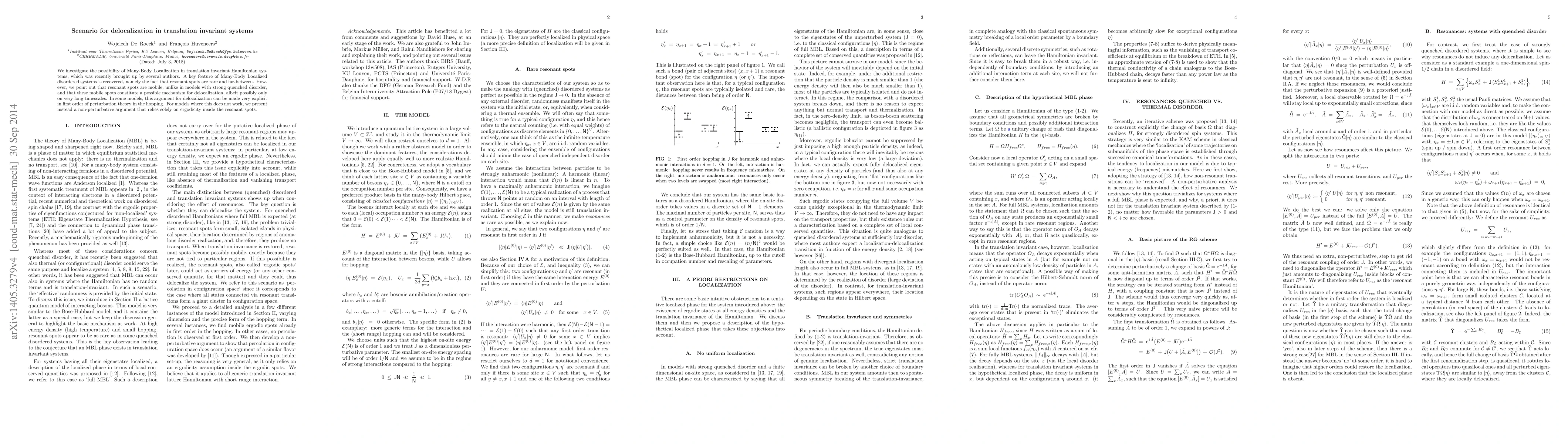 This paper explores the potential for Many-Body Localization in translation invariant systems, noting that while resonant spots are rare, their mobility may enable delocalization, especially over long timescales. The authors provide both perturbative and non-perturbative arguments to support this delocalization mechanism.