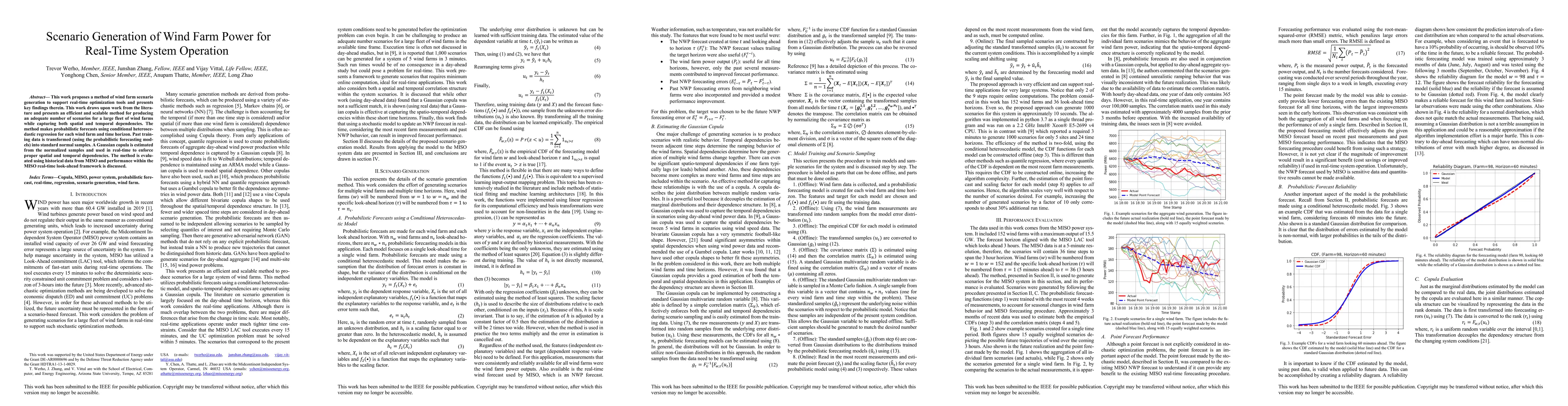 This work proposes a method of wind farm scenario generation to support real-time optimization tools and presents key findings therein. This work draws upon work from the literature and presents an efficient and scalable method for producing an adequate number of scenarios for a large fleet of wind farms while capturing both spatial and temporal dependencies. The method makes probabilistic forecasts using conditional heteroscedastic regression for each wind farm and time horizon. Past training data is transformed (using the probabilistic forecasting models) into standard normal samples. A Gaussian copula is estimated from the normalized samples and used in real-time to enforce proper spatial and temporal dependencies. The method is evaluated using historical data from MISO and performance within the MISO real-time look-ahead framework is discussed.