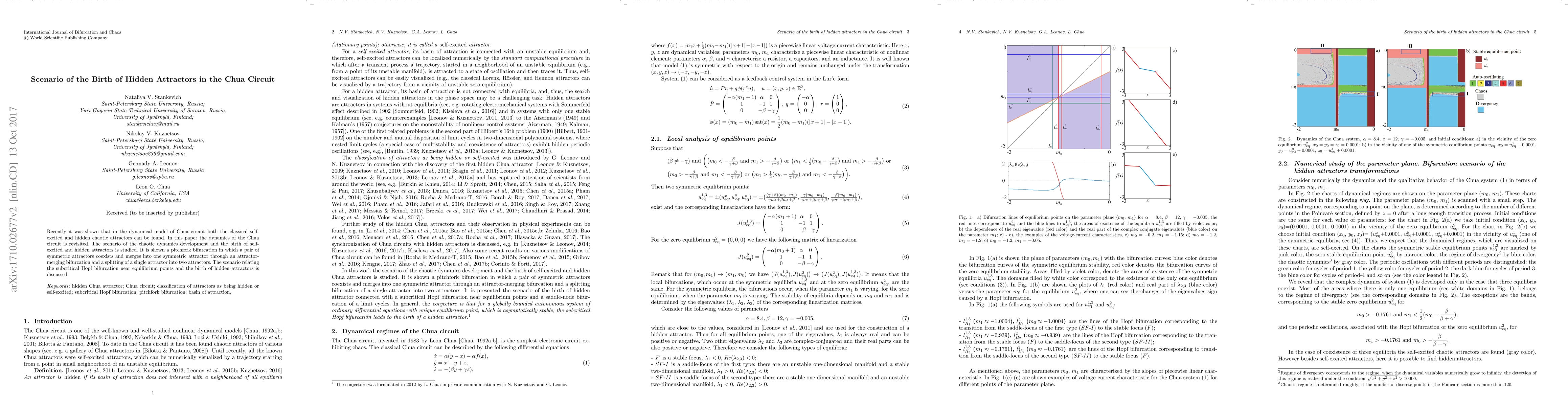 This paper investigates the dynamics of the Chua circuit, revealing the emergence of both classical and hidden chaotic attractors through bifurcations. It details the interplay between pitchfork and attractor-merging bifurcations, and explores the subcritical Hopf bifurcation leading to the birth of hidden attractors.