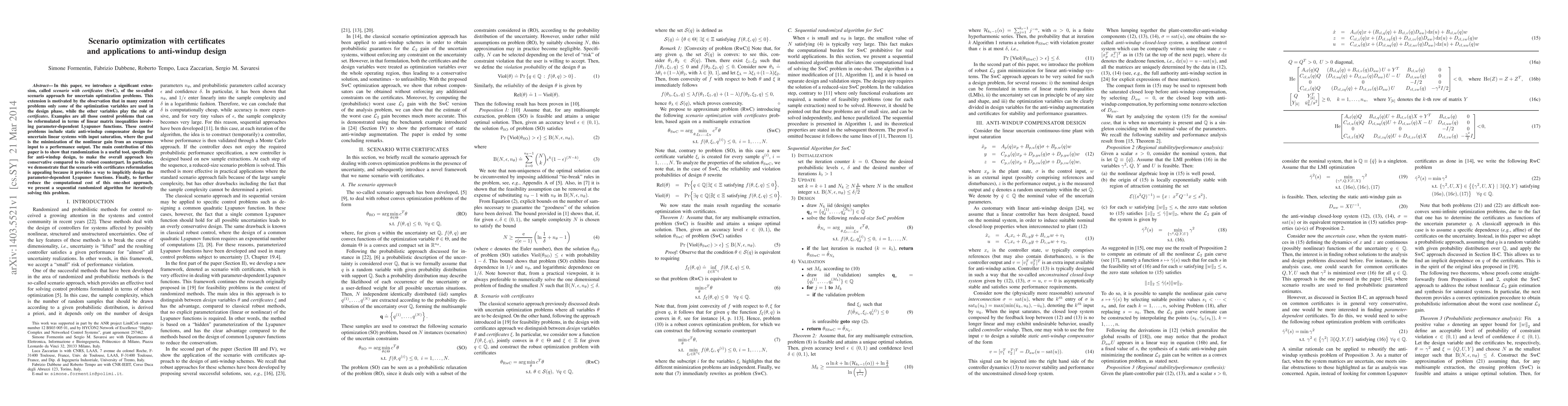 In this paper, we introduce a significant extension, called scenario with certificates (SwC), of the so-called scenario approach for uncertain optimization problems. This extension is motivated by the observation that in many control problems only some of the optimization variables are used in the design phase, while the other variables play the role of certificates. Examples are all those control problems that can be reformulated in terms of linear matrix inequalities involving parameter-dependent Lyapunov functions. These control problems include static anti-windup compensator design for uncertain linear systems with input saturation, where the goal is the minimization of the nonlinear gain from an exogenous input to a performance output. The main contribution of this paper is to show that randomization is a useful tool, specifically for anti-windup design, to make the overall approach less conservative compared to its robust counterpart. In particular, we demonstrate that the scenario with certificates reformulation is appealing because it provides a way to implicitly design the parameter-dependent Lyapunov functions. Finally, to further reduce the computational cost of this one-shot approach, we present a sequential randomized algorithm for iteratively solving this problem.