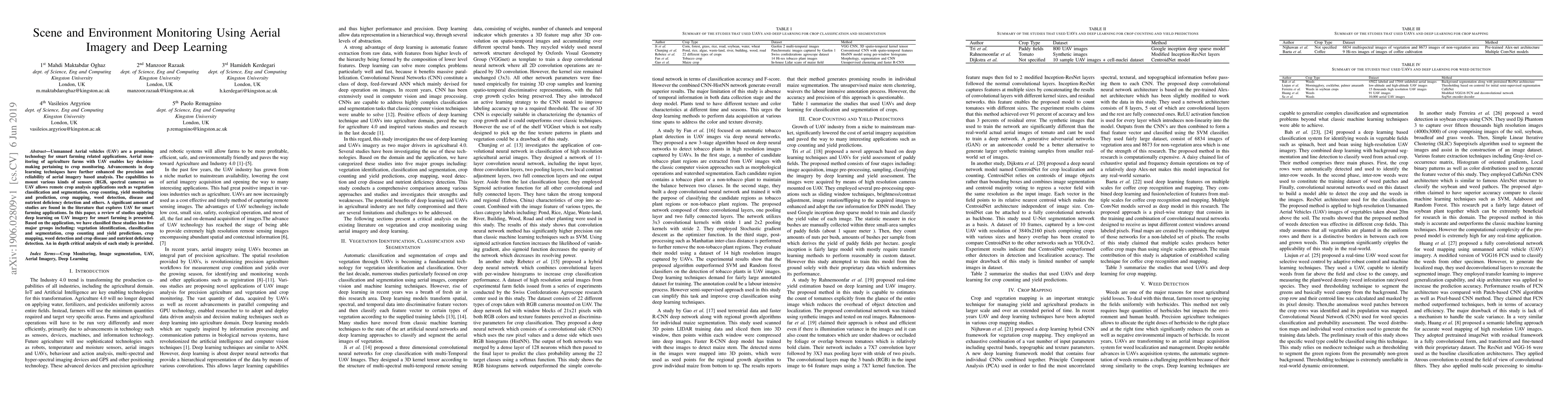This paper reviews studies employing UAVs equipped with deep learning for smart farming, categorizing them into vegetation analysis, crop counting, mapping, weed detection, and disease/nutrient deficiency identification. It provides a critical analysis of the methodologies and advancements in aerial imagery-based crop monitoring.