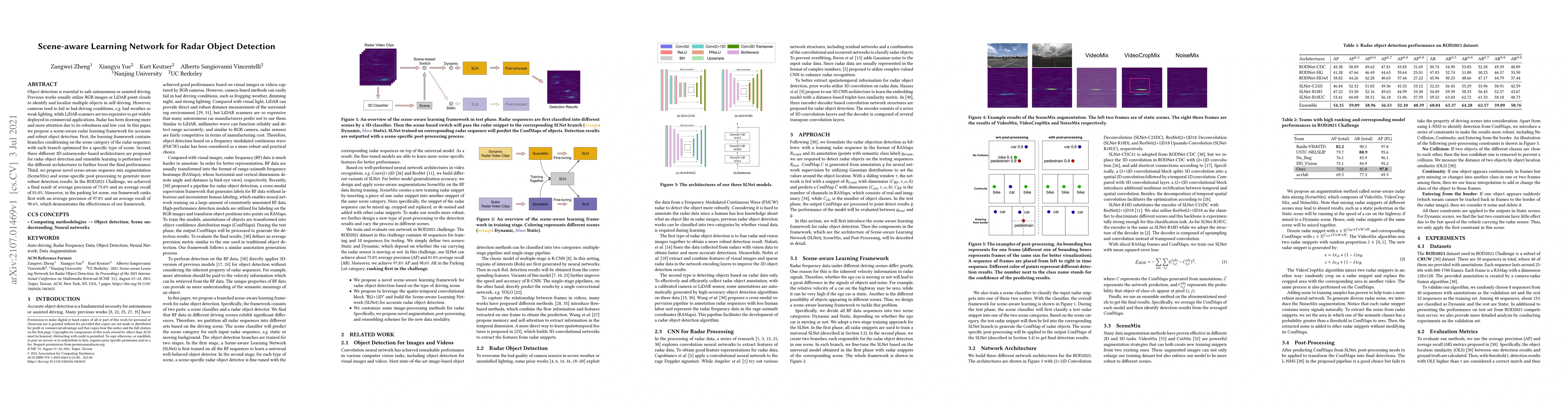 Object detection is essential to safe autonomous or assisted driving. Previous works usually utilize RGB images or LiDAR point clouds to identify and localize multiple objects in self-driving. However, cameras tend to fail in bad driving conditions, e.g. bad weather or weak lighting, while LiDAR scanners are too expensive to get widely deployed in commercial applications. Radar has been drawing more and more attention due to its robustness and low cost. In this paper, we propose a scene-aware radar learning framework for accurate and robust object detection. First, the learning framework contains branches conditioning on the scene category of the radar sequence; with each branch optimized for a specific type of scene. Second, three different 3D autoencoder-based architectures are proposed for radar object detection and ensemble learning is performed over the different architectures to further boost the final performance. Third, we propose novel scene-aware sequence mix augmentation (SceneMix) and scene-specific post-processing to generate more robust detection results. In the ROD2021 Challenge, we achieved a final result of average precision of 75.0% and an average recall of 81.0%. Moreover, in the parking lot scene, our framework ranks first with an average precision of 97.8% and an average recall of 98.6%, which demonstrates the effectiveness of our framework.
