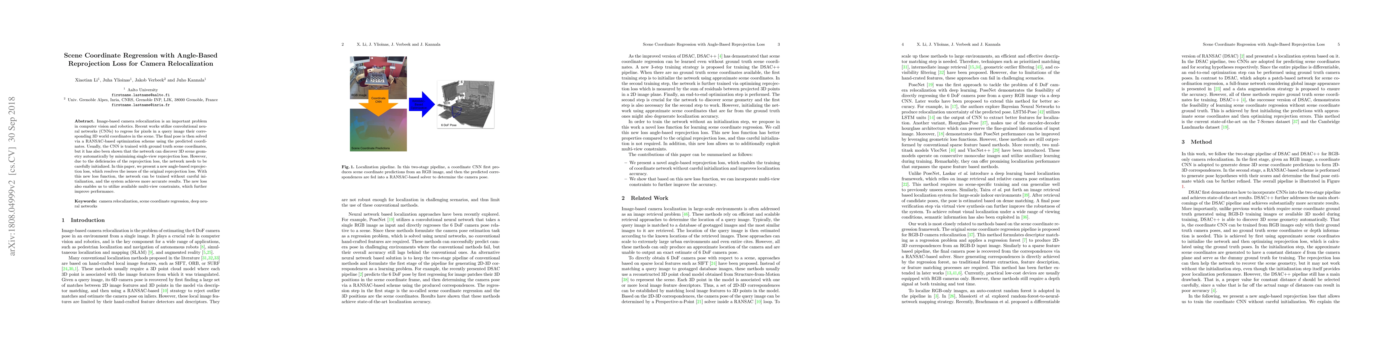 This paper introduces an angle-based reprojection loss for camera relocalization, improving upon traditional reprojection loss to enable more accurate pose estimation without the need for careful network initialization. The new loss leverages multi-view constraints to further enhance performance.