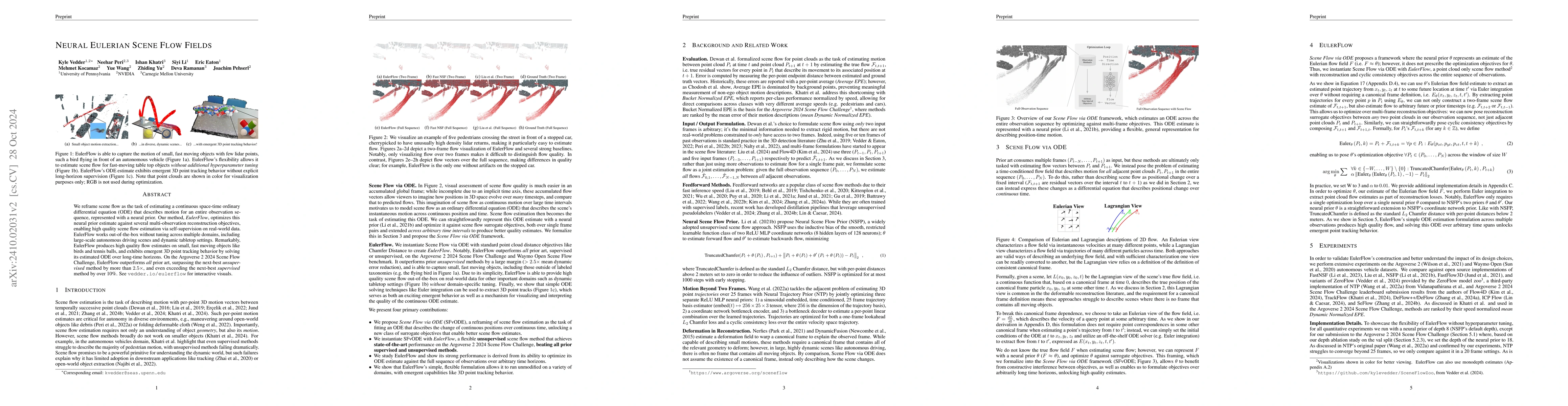 Title: Scene Flow as a Partial Differential Equation Summary: This research presents EulerFlow, an unsupervised method for estimating scene flow through a continuous space-time PDE, achieving high-quality results in autonomous driving and dynamic settings, especially for fast-moving objects, and outperforming both unsupervised and supervised baselines on the Argoverse 2 2024 Scene Flow Challenge.