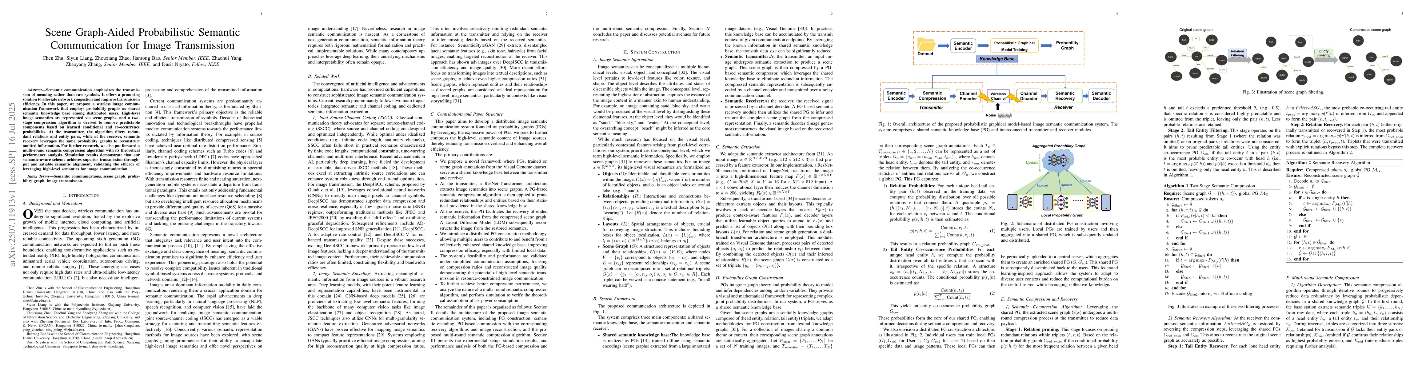 Semantic communication emphasizes the transmission of meaning rather than raw symbols. It offers a promising solution to alleviate network congestion and improve transmission efficiency. In this paper, we propose a wireless image communication framework that employs probability graphs as shared semantic knowledge base among distributed users. High-level image semantics are represented via scene graphs, and a two-stage compression algorithm is devised to remove predictable components based on learned conditional and co-occurrence probabilities. At the transmitter, the algorithm filters redundant relations and entity pairs, while at the receiver, semantic recovery leverages the same probability graphs to reconstruct omitted information. For further research, we also put forward a multi-round semantic compression algorithm with its theoretical performance analysis. Simulation results demonstrate that our semantic-aware scheme achieves superior transmission throughput and satiable semantic alignment, validating the efficacy of leveraging high-level semantics for image communication.