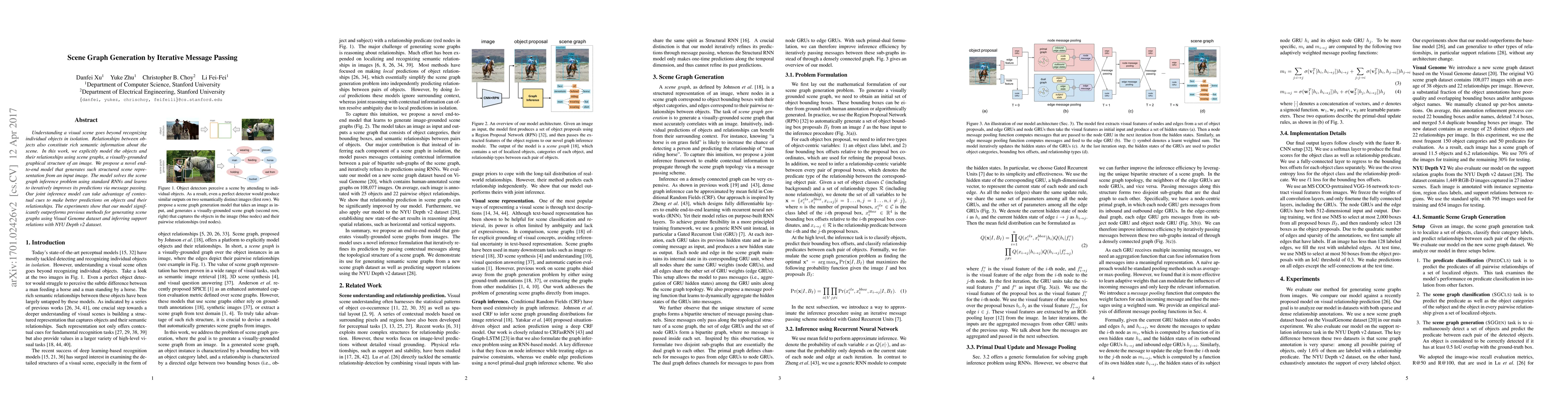 This paper proposes an end-to-end model for generating scene graphs from images using iterative message passing with RNNs, significantly outperforming previous methods on datasets like Visual Genome and NYU Depth v2 by leveraging contextual cues.