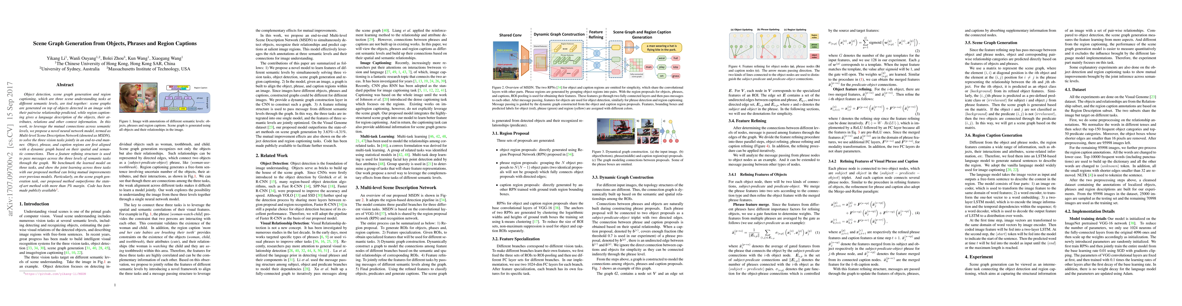 This paper proposes a Multi-level Scene Description Network (MSDN) to jointly solve object detection, scene graph generation, and region captioning tasks. The model aligns objects, phrases, and regions dynamically and refines features across semantic levels, achieving state-of-the-art performance on scene graph generation with a 3% improvement.