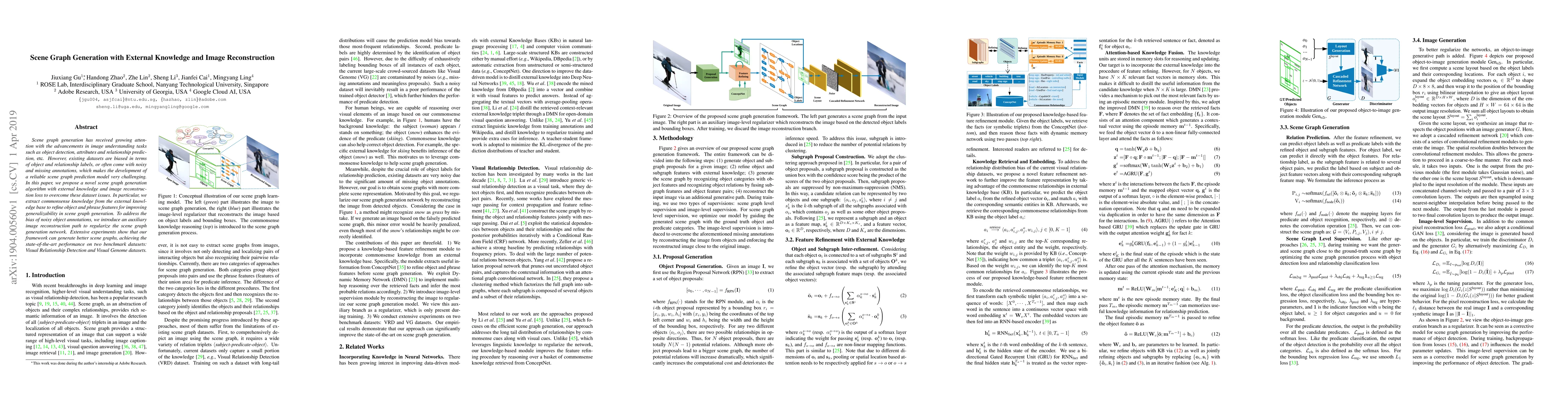 This paper proposes a novel scene graph generation algorithm that leverages external knowledge and an image reconstruction loss to improve the reliability of scene graph predictions. The method refines object and relationship features using commonsense knowledge and regularizes the model with an image reconstruction path to address dataset biases and noisy annotations.