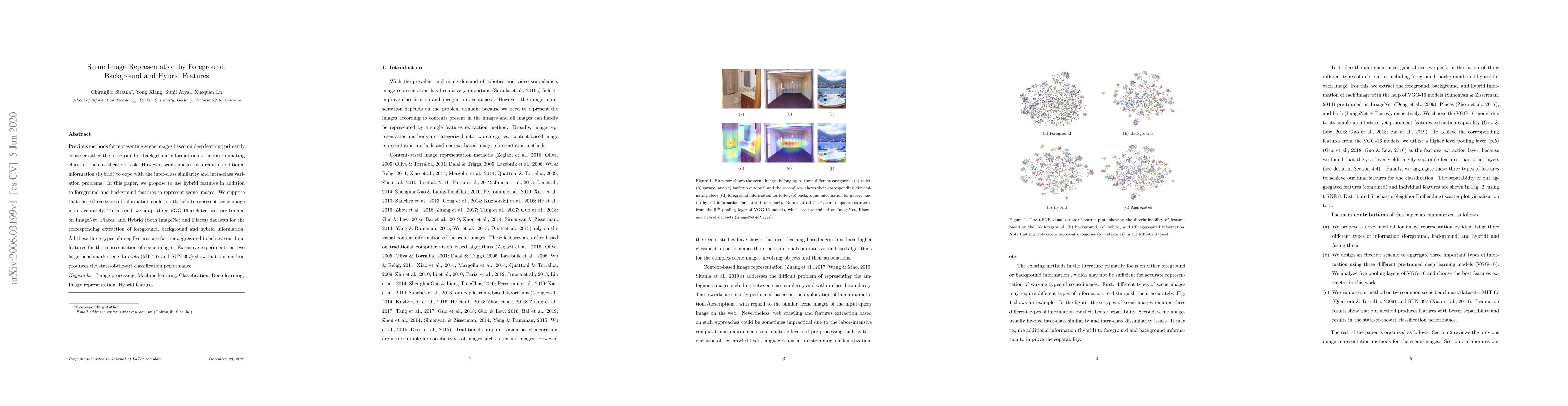 This paper proposes a method to represent scene images using hybrid features alongside foreground and background features, aiming to address inter-class similarity and intra-class variation issues. It employs three VGG-16 architectures to extract the respective features and aggregates them for improved scene classification, achieving state-of-the-art results on MIT-67 and SUN-397 datasets.