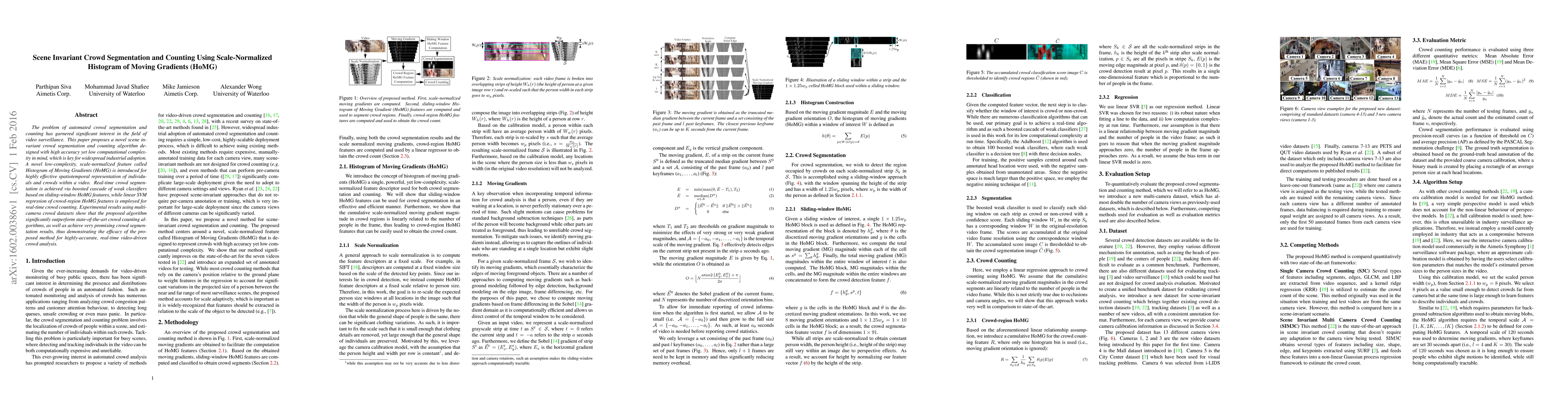 The problem of automated crowd segmentation and counting has garnered significant interest in the field of video surveillance. This paper proposes a novel scene invariant crowd segmentation and counting algorithm designed with high accuracy yet low computational complexity in mind, which is key for widespread industrial adoption. A novel low-complexity, scale-normalized feature called Histogram of Moving Gradients (HoMG) is introduced for highly effective spatiotemporal representation of individuals and crowds within a video. Real-time crowd segmentation is achieved via boosted cascade of weak classifiers based on sliding-window HoMG features, while linear SVM regression of crowd-region HoMG features is employed for real-time crowd counting. Experimental results using multi-camera crowd datasets show that the proposed algorithm significantly outperform state-of-the-art crowd counting algorithms, as well as achieve very promising crowd segmentation results, thus demonstrating the efficacy of the proposed method for highly-accurate, real-time video-driven crowd analysis.