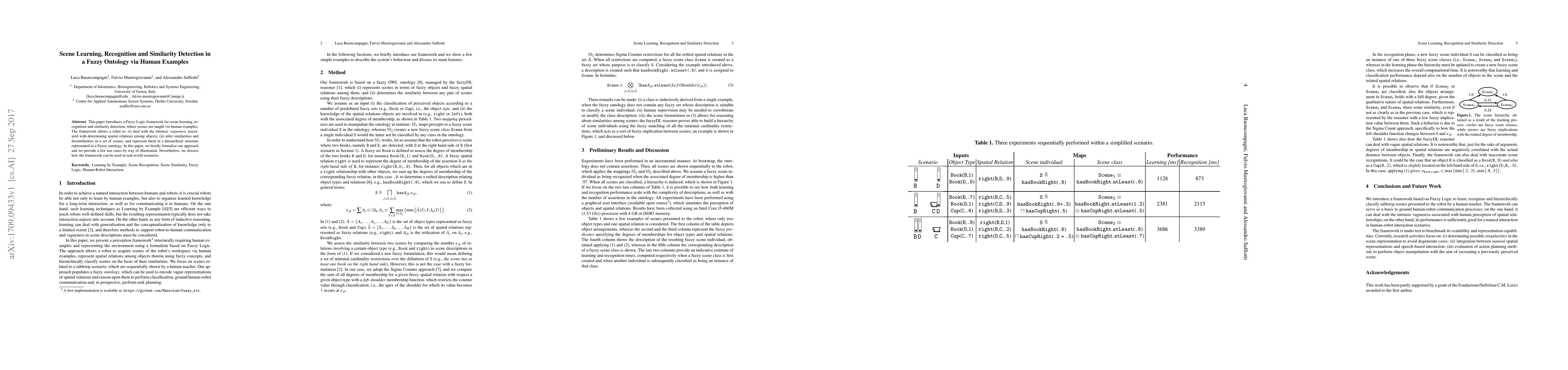 This paper introduces a Fuzzy Logic framework for scene learning, recognition and similarity detection, where scenes are taught via human examples. The framework allows a robot to: (i) deal with the intrinsic vagueness associated with determining spatial relations among objects; (ii) infer similarities and dissimilarities in a set of scenes, and represent them in a hierarchical structure represented in a Fuzzy ontology. In this paper, we briefly formalize our approach and we provide a few use cases by way of illustration. Nevertheless, we discuss how the framework can be used in real-world scenarios.